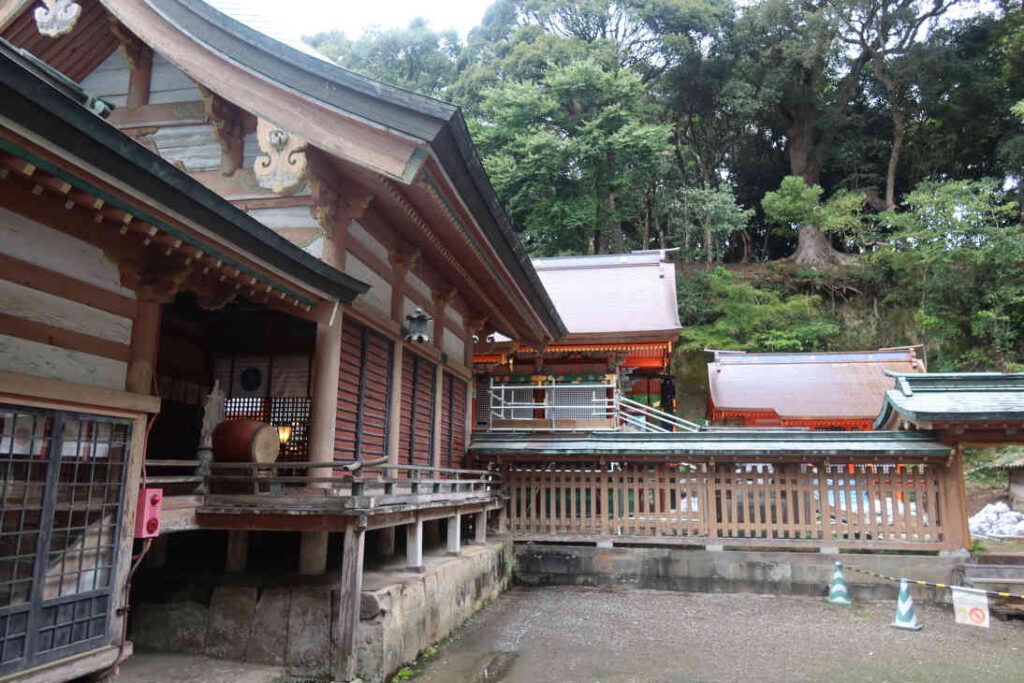 拝殿から渡り廊下みたいに拝殿前の廻廊まで繋がっていて、拝殿の正面に立つ場所が無く「何処からお参りすればいいんだ(?_‽)」状態でした。授与所で御朱印をお願いした後、聞いてみたら、拝殿前にある廻廊に靴を脱いで上がって真ん中辺りまで行くと拝殿の正面に立てて参拝できるとの事でした。立派な廻廊で、上がって良いとは思いませんでした。3段だったか?階段上がって、廻廊を真ん中位まで行くと、赤い絨毯が敷かれお賽銭箱があったので、此処で参拝させて頂きました。