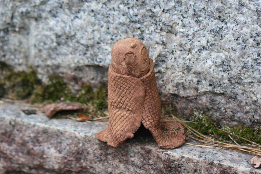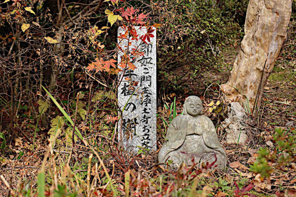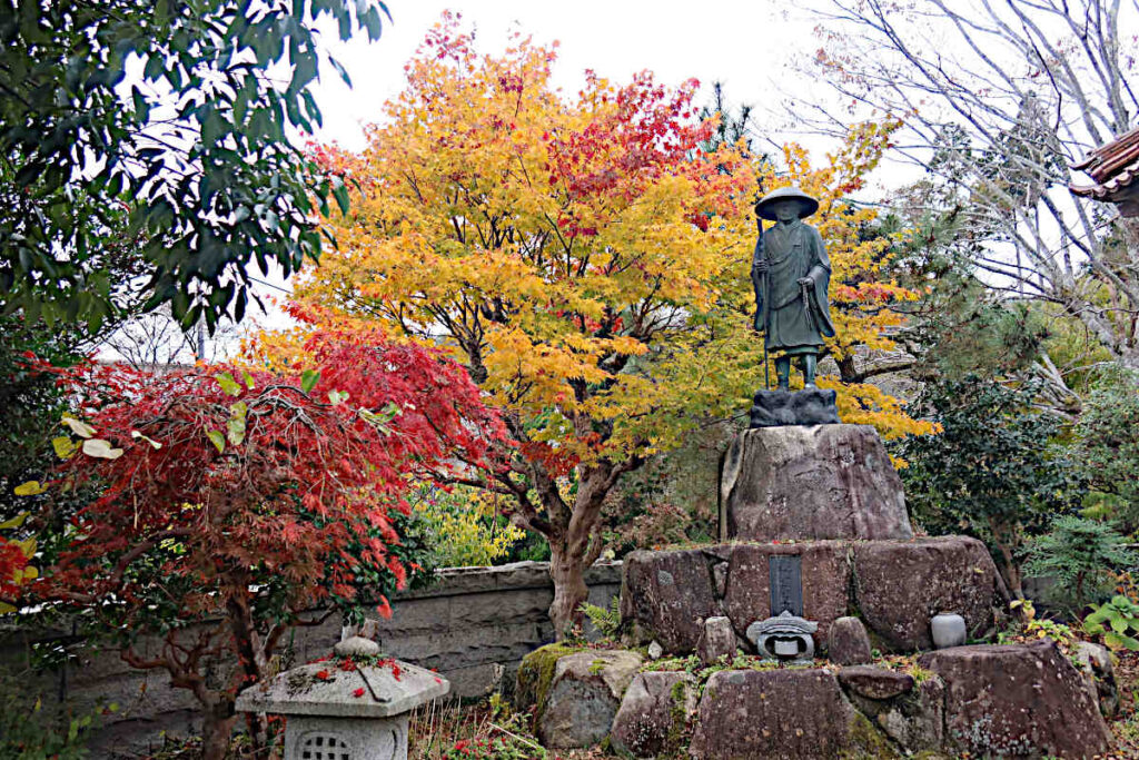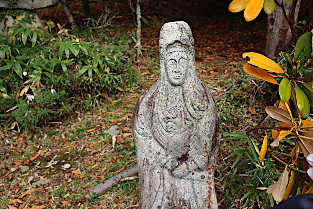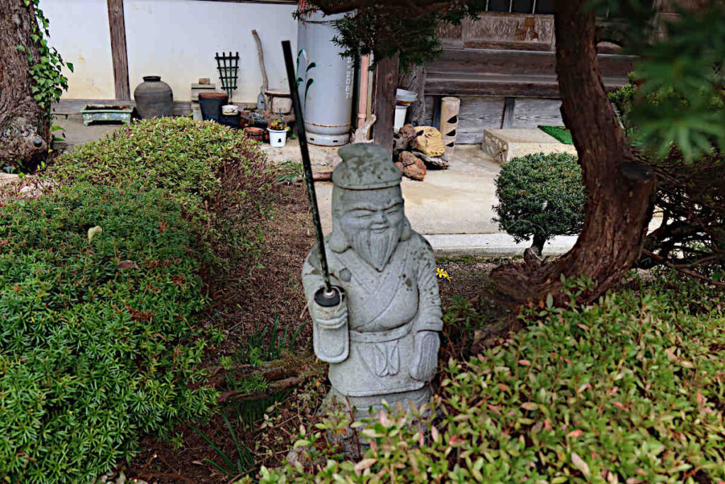 その後は「オタスケ衆」と言う事で、本堂や境内のお掃除のお手伝いを行いました。私は、主に山門周辺で落ち葉の掃除をしてました。途中、休憩でお茶やお菓子を頂いた時、ふと見ると、木の陰に何かの像を発見。近づいてみると竿を持っていたので恵比須様の石像のようでした。奥様によると「先代のご住職がこういった像とかを境内のあっちこっちに配置するのが好きだった」と言われてました。