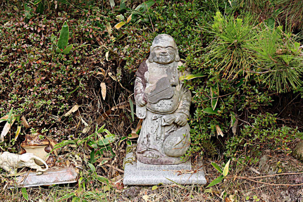 そこで、掃除の後半は、ほうきを持ったまま、掃除をしているふり(^^;)をしながら、他の像探しに専念してました(罰当たりですね^^;) 7体揃っているのかは未確認ですが、結局、発見したのは、恵比須様、布袋様、弁天様(かな?)の3体。プラスで大黒様?か、小判を撒く人、受ける人の2人組の像を発見(^_^) 布袋様以外は皆さん木々の陰に隠れるようにたっていました。