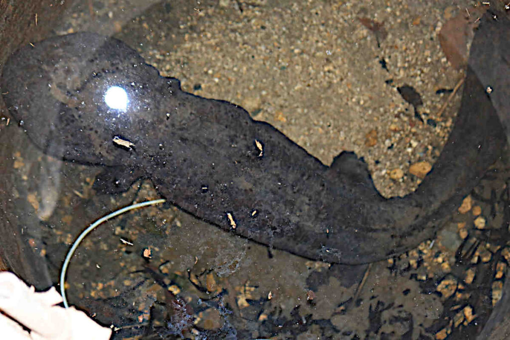 ツアーの参加者の方が「ハンザキ」だと言われてました。オオサンショウウオの別名(地域語?)で、最初、ピンと来なかったのですが、由来の「オオサンショウウオは半分に切り裂いても生きているから」と言われると、昔、聞いた事があったと思い出しました。(実際には、高い再生能力はあるものの、半分に切り裂かれると生きてはいられないようですが^^;)