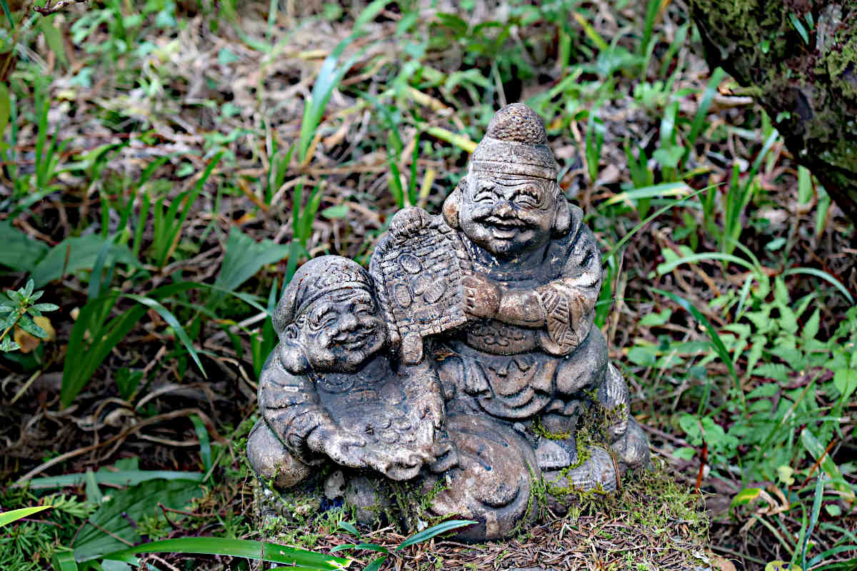 そこで、掃除の後半は、ほうきを持ったまま、掃除をしているふり(^^;)をしながら、他の像探しに専念してました(罰当たりですね^^;) 7体揃っているのかは未確認ですが、結局、発見したのは、恵比須様、布袋様、弁天様(かな?)の3体。プラスで大黒様?か、小判を撒く人、受ける人の2人組の像を発見(^_^) 布袋様以外は皆さん木々の陰に隠れるようにたっていました。