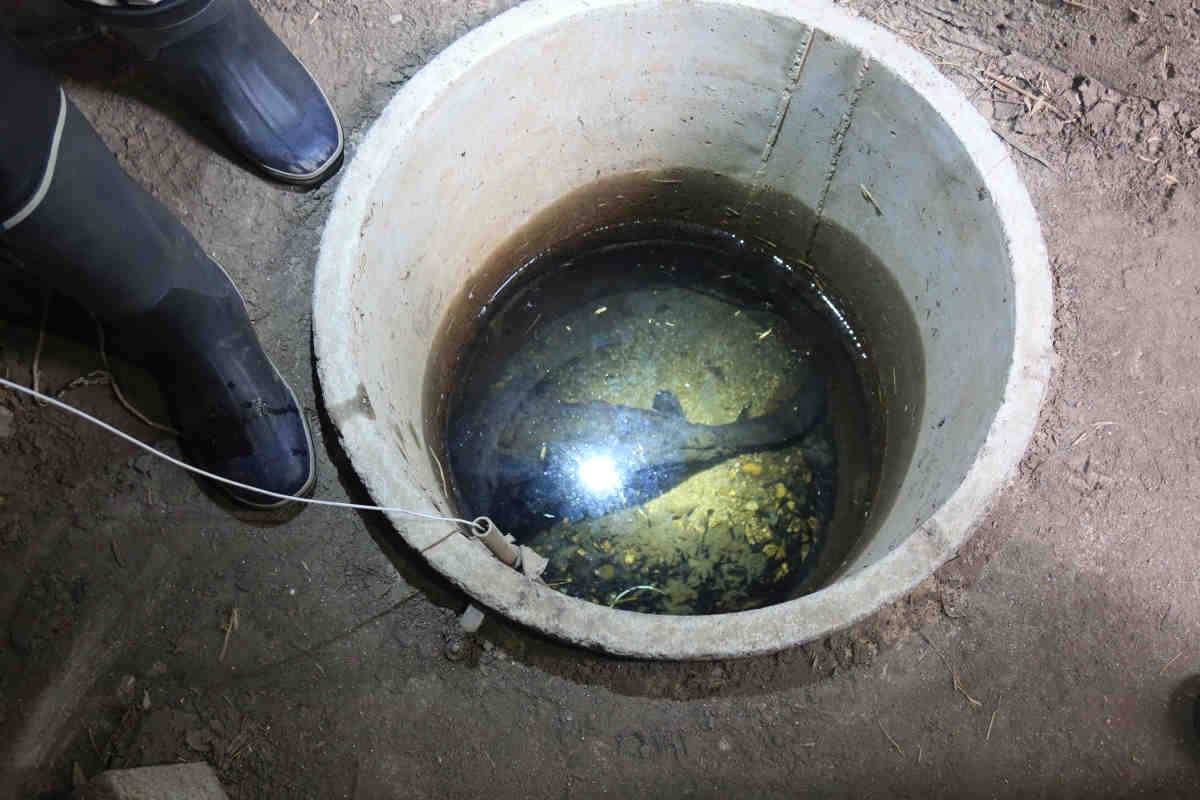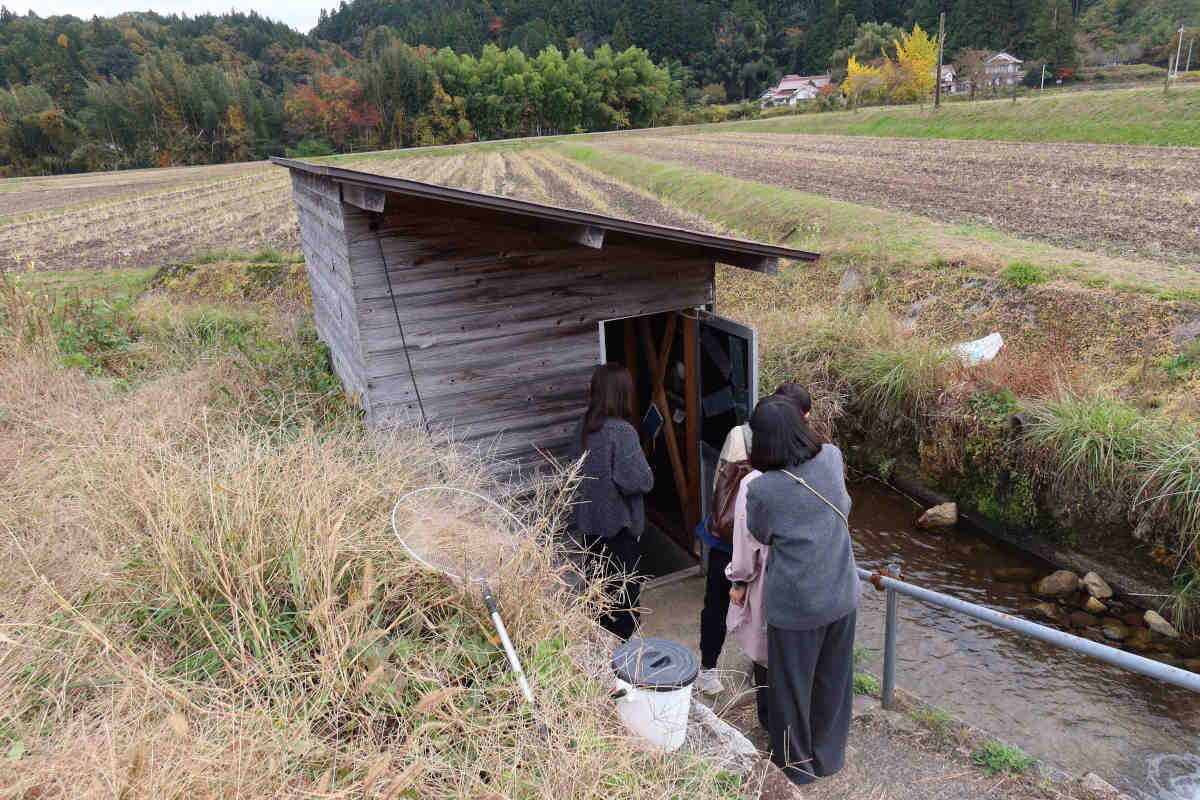 お斎の後は、プロジェクターを使ったオオサンショウウオの専門家による説明を受けた後、近くにある飼育小屋へ連れて行って貰いました。田んぼか畑か沿いの小さな川の横に小さな小屋が建っていて、その中からオオサンショウウオを鑑賞できる穴が開いてました。小屋は狭く2,3人位づつが交代で入り、穴を覗いてみました。大きなオオサンショウウオ(主と言われるオス)と主の回りをオタマジャクシみたいに泳ぎ回る生まれて間もない子供たちが見れました。オオサンショウウオはオスが卵の世話から育児までやるそうです。