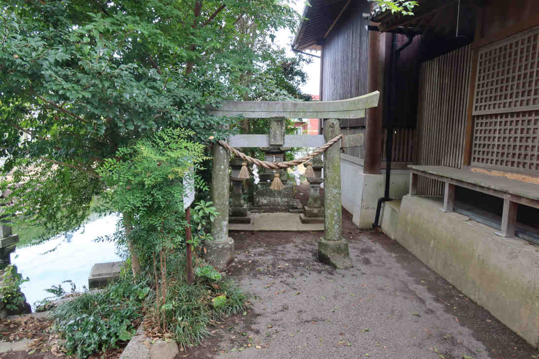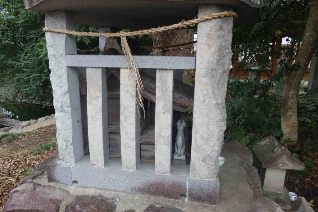 宝池の前辺りに石室みたいな物があり、全体が石板に囲まれ左右の部分のみが石格子になっていました。細い隙間から覗くと狐の置物と小さな祠が見え、稲荷神社のようでした。何で全体を囲っているのか等の説明はありませんでした。