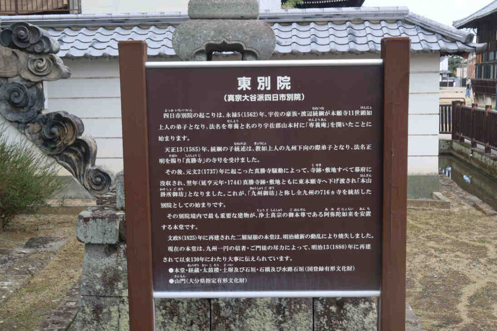 四日市別院の起こりは、永禄5(1562)年、宇佐の豪族・渡辺統綱が本願寺11世顕如上人の弟子となり、法名を専養と名のり宇佐郡山本村に「専養庵」を開いたことに始まります。