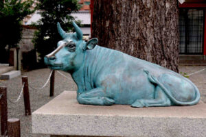 菅原道真公も合祀されているせいか、入り口の鳥居の右側と拝殿の右側に、それぞれ牛が寝そべってのんびりしてました。