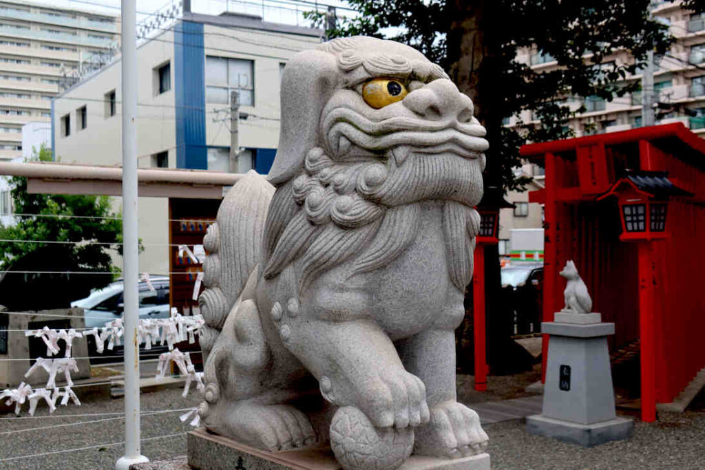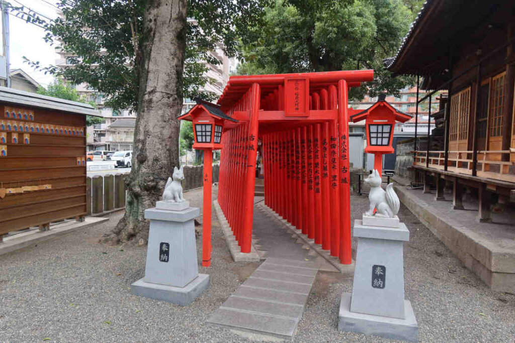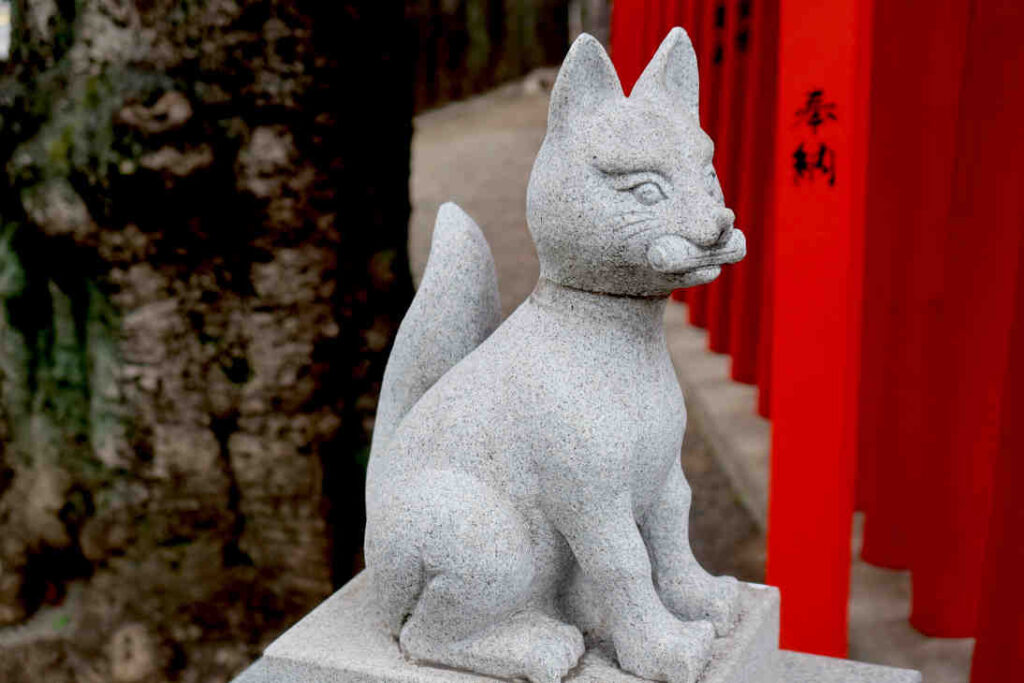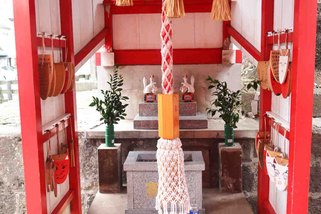 拝殿の左側には赤鳥居が並んでいる稲荷神社がありました。赤鳥居の手前には石製の狛狐、奥の方には陶器?の御狐様がいらっしゃいました。