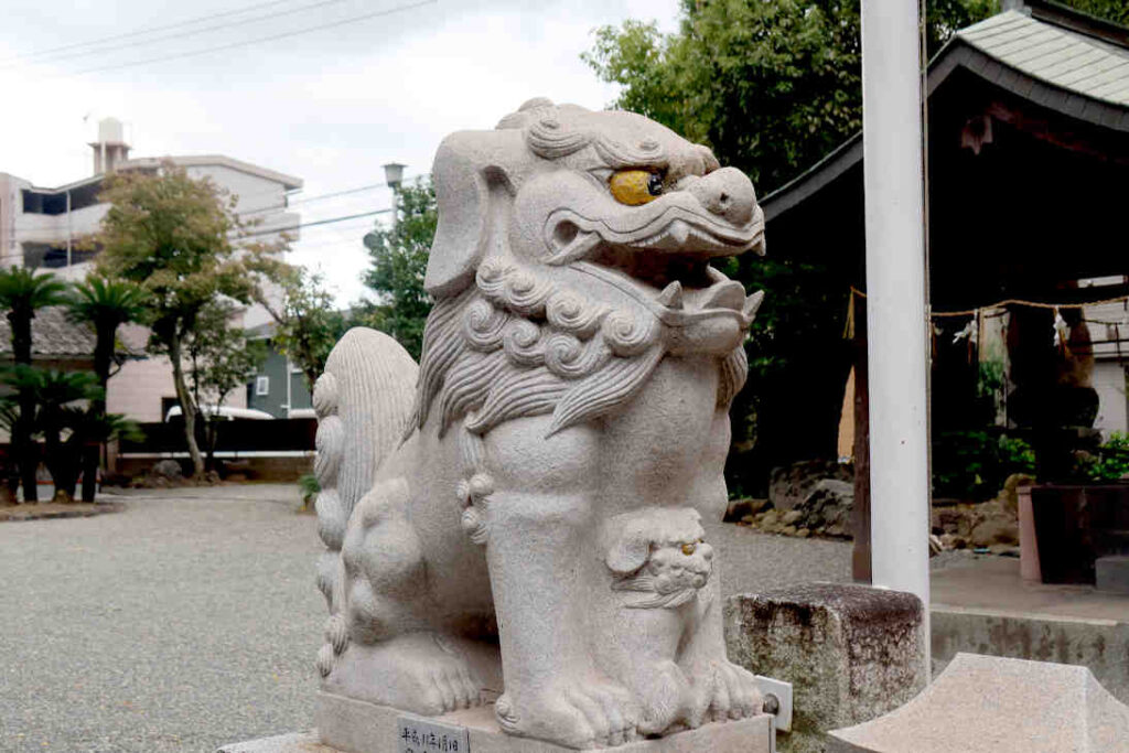 拝殿前の狛犬、まだ新しいみたいで端正な顔立ちをしていました。阿形は子供連れ、吽型は毬を踏んでいました。同じ系列の顔立ちですが、見る角度にもよるのでしょうが、阿形は勇ましく、吽型はコミカルな顔立ちに見えました。口を開けているか閉めているかで印象が全然違ってました。