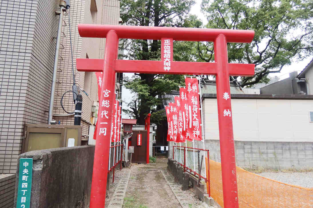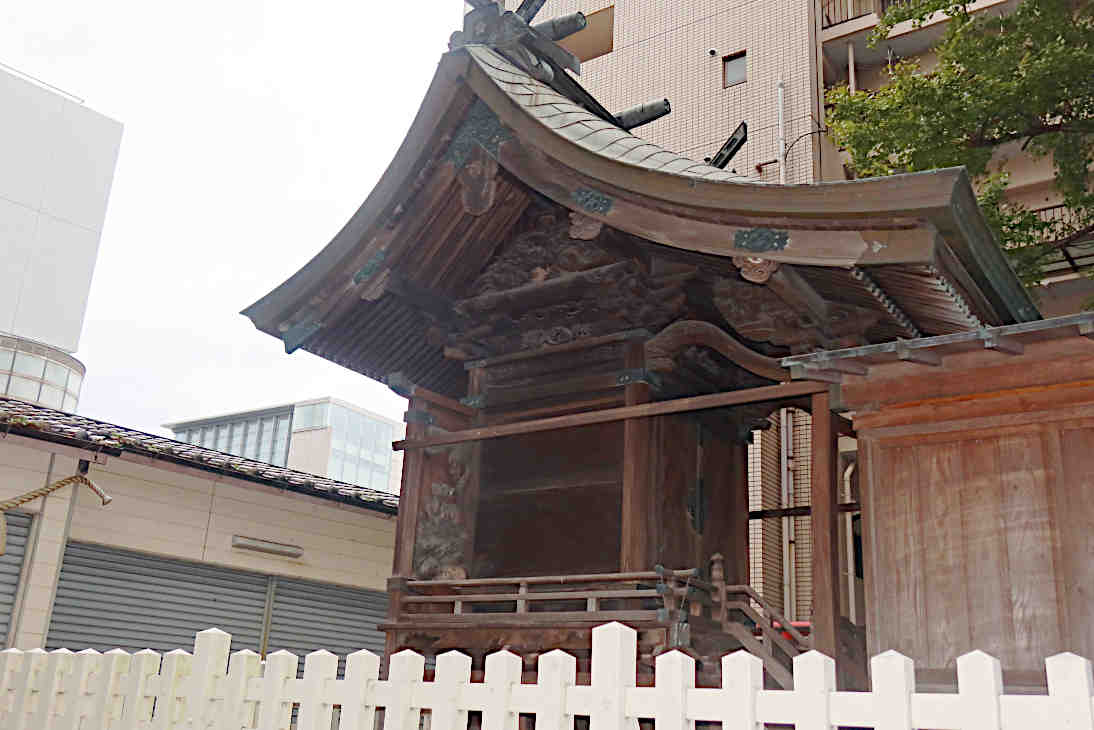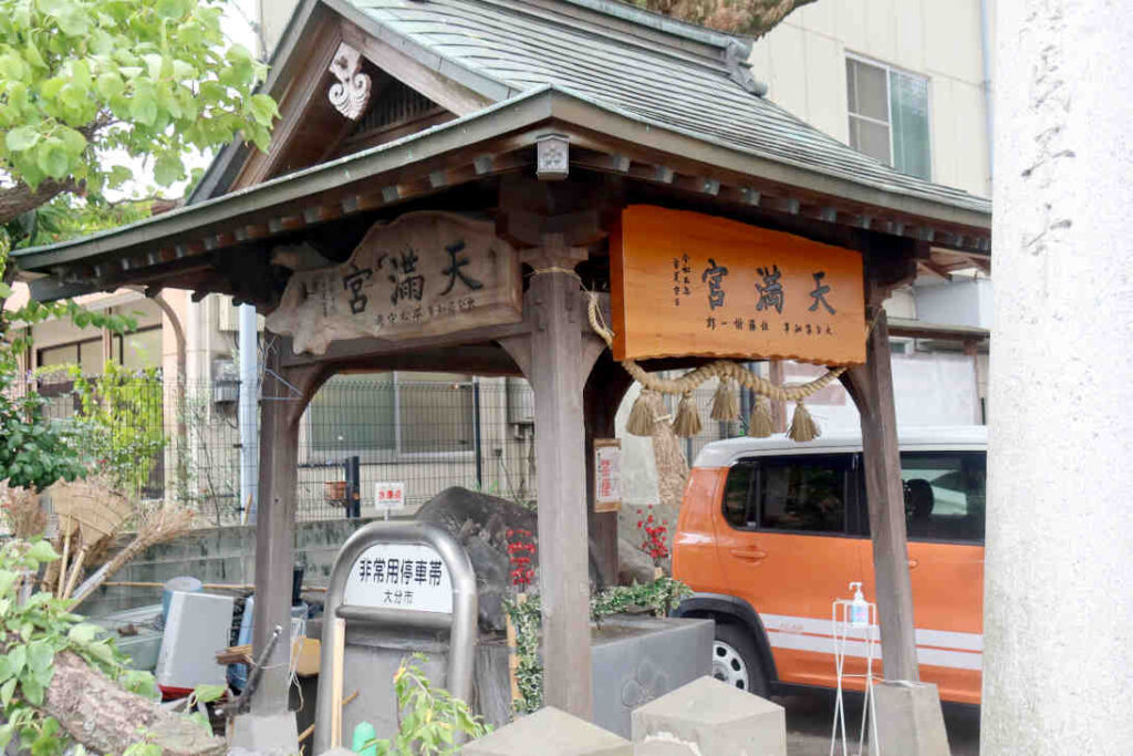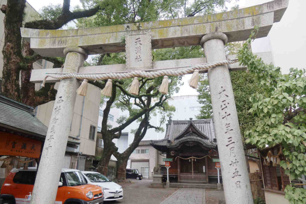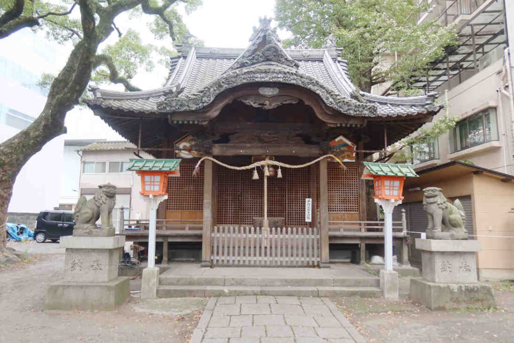 大分県大分市中央町に建っている「西新町天満社(にししんまちてんまんしゃ)」です。JR大分駅から徒歩約12分、福寿院からだと15分位です(googleマップ経路情報より)