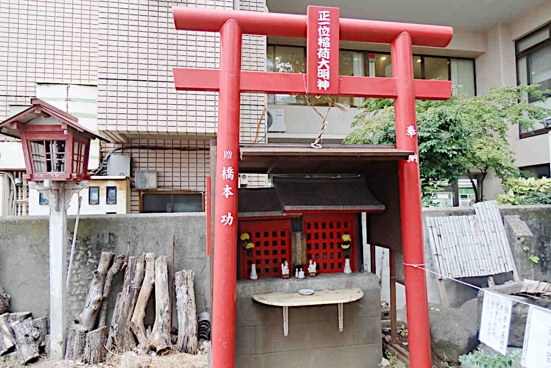 裏門側は「正一位稲荷大明神」と書かれた扁額を掲げた赤鳥居がたっていて狭い通路の先の左側に稲荷神社の小さな祠がたっていました。稲荷神社の先、「銀杏が落ちてきて危険」と紐が張られて道が通行止め、さらに細い道へと案内され、大きく回ってやっと天神様の社殿の前にでました。