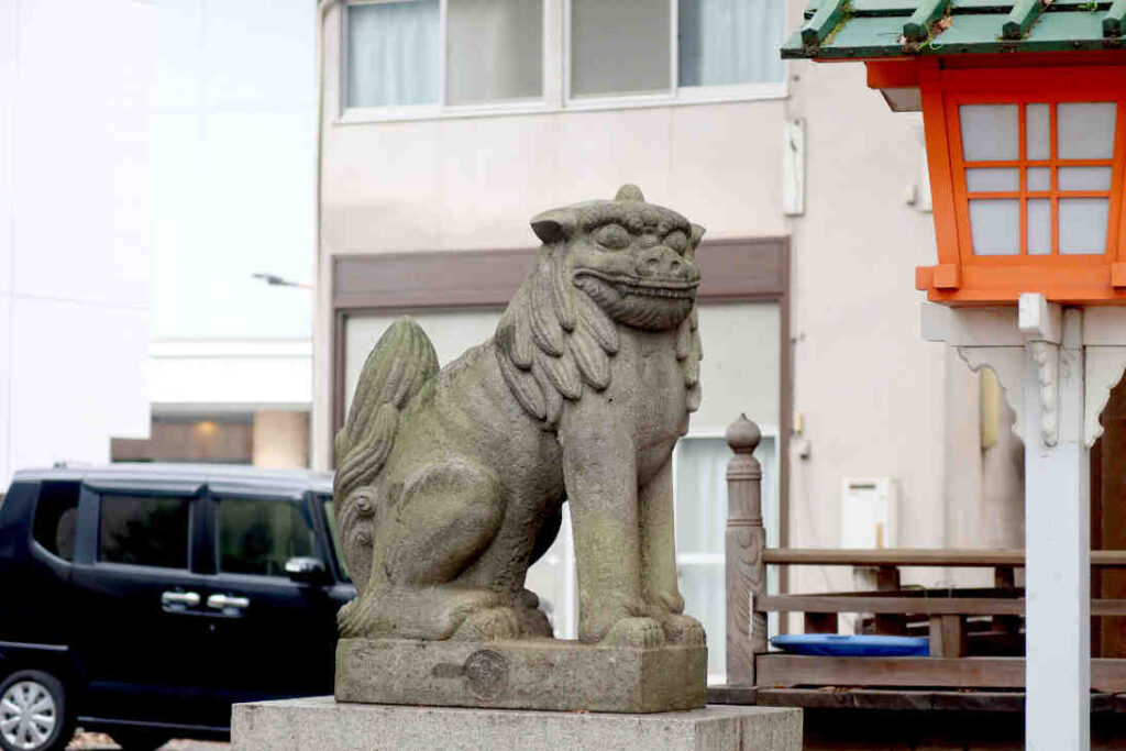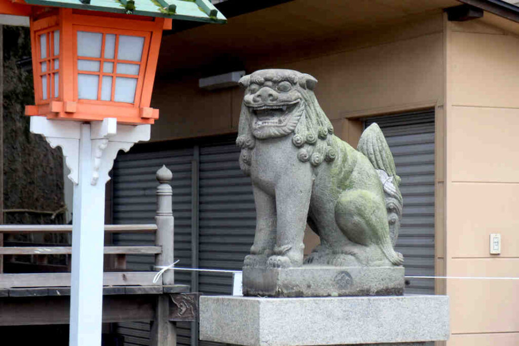 拝殿前の狛犬、形自体はシンプルなお座り型の狛犬でちょっとおカッパ頭風の髪(タテガミ)で、吽型の方は角ありタイプでした。