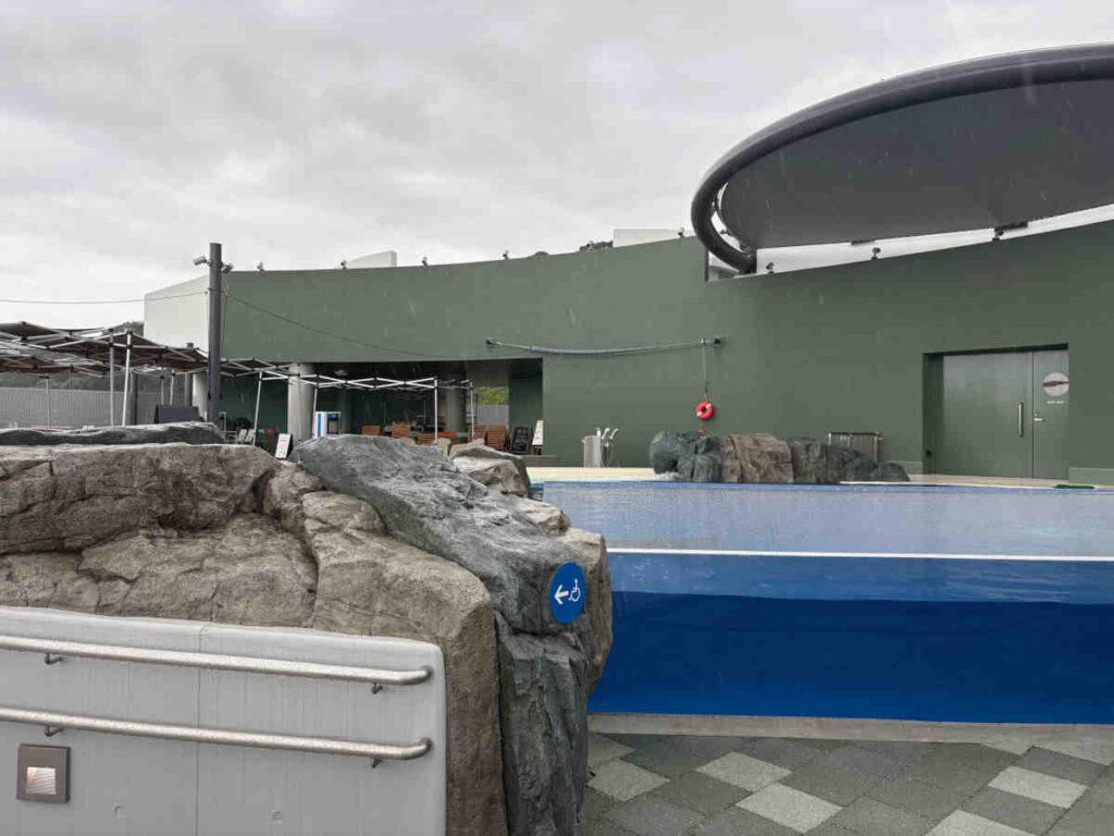 11時前になったので、イルカのショーが行われる会場に行ってみました。思ったより狭いプールでした。正面になる方は指定席なのか?子供たちが水除のシートを持って座っていました。私は反対側、人の少ないステージの上の方から見ることにしました。