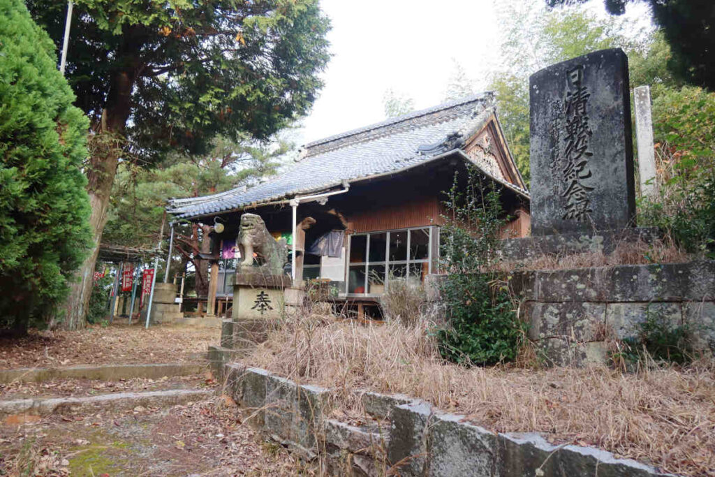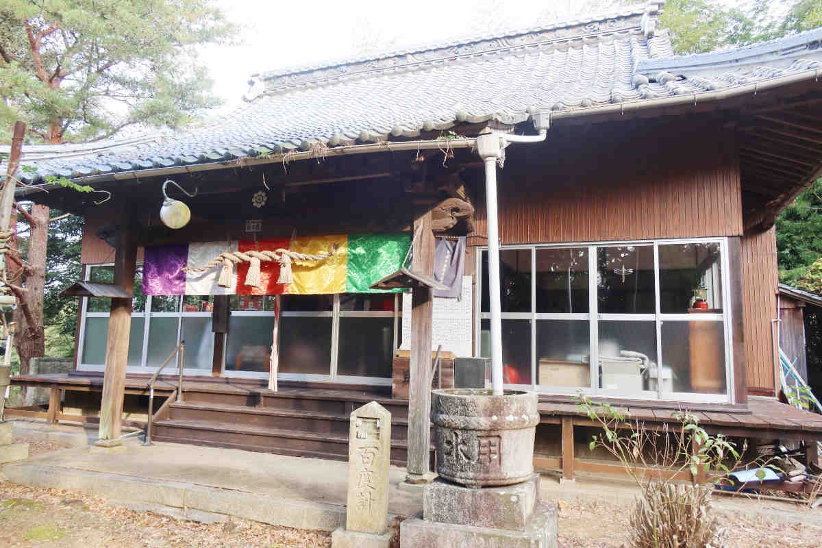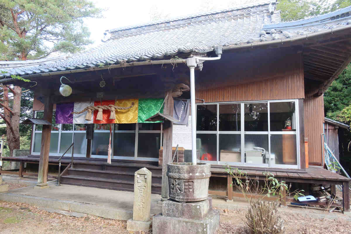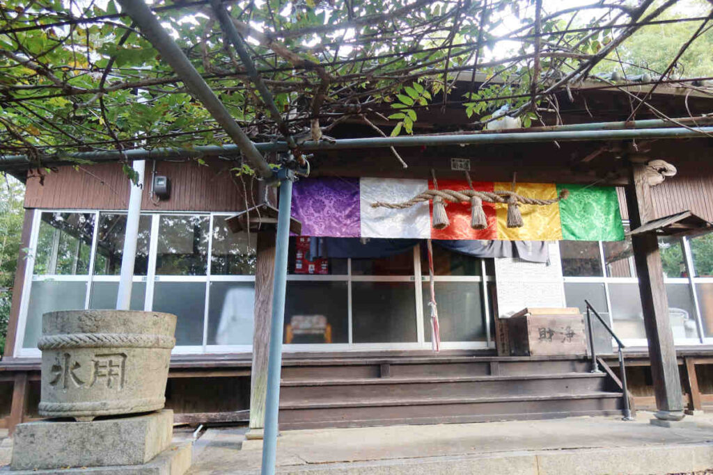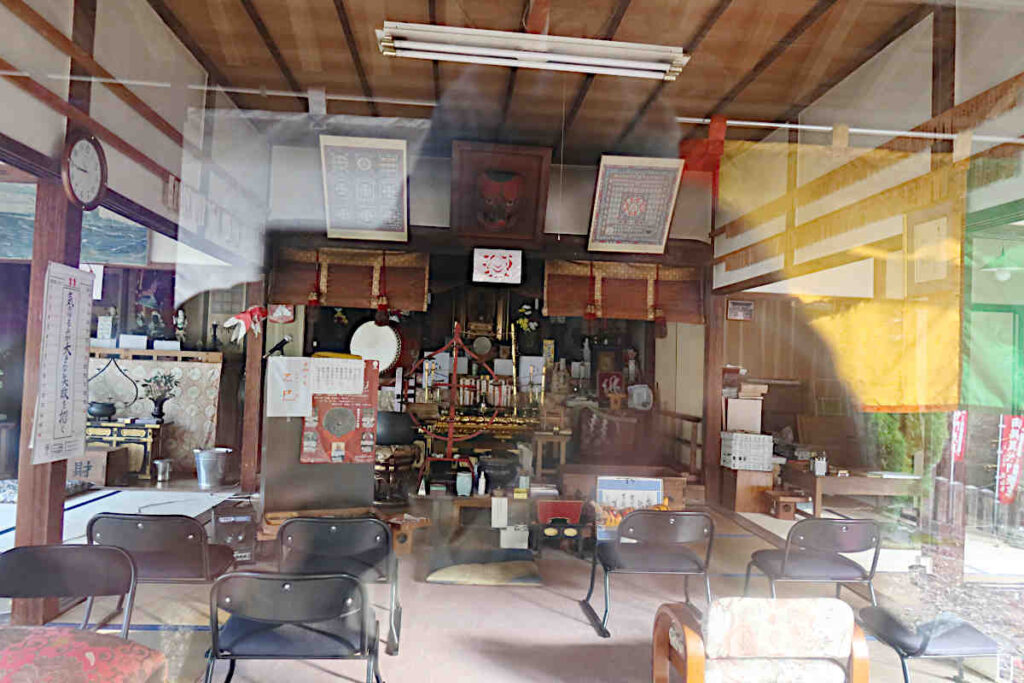 本堂の扉は閉まってましたが、ほぼガラス張りなので、中は良く見えました。中央部に鏡と毘沙門天像?が安置されていてこちらも神仏習合ですね。