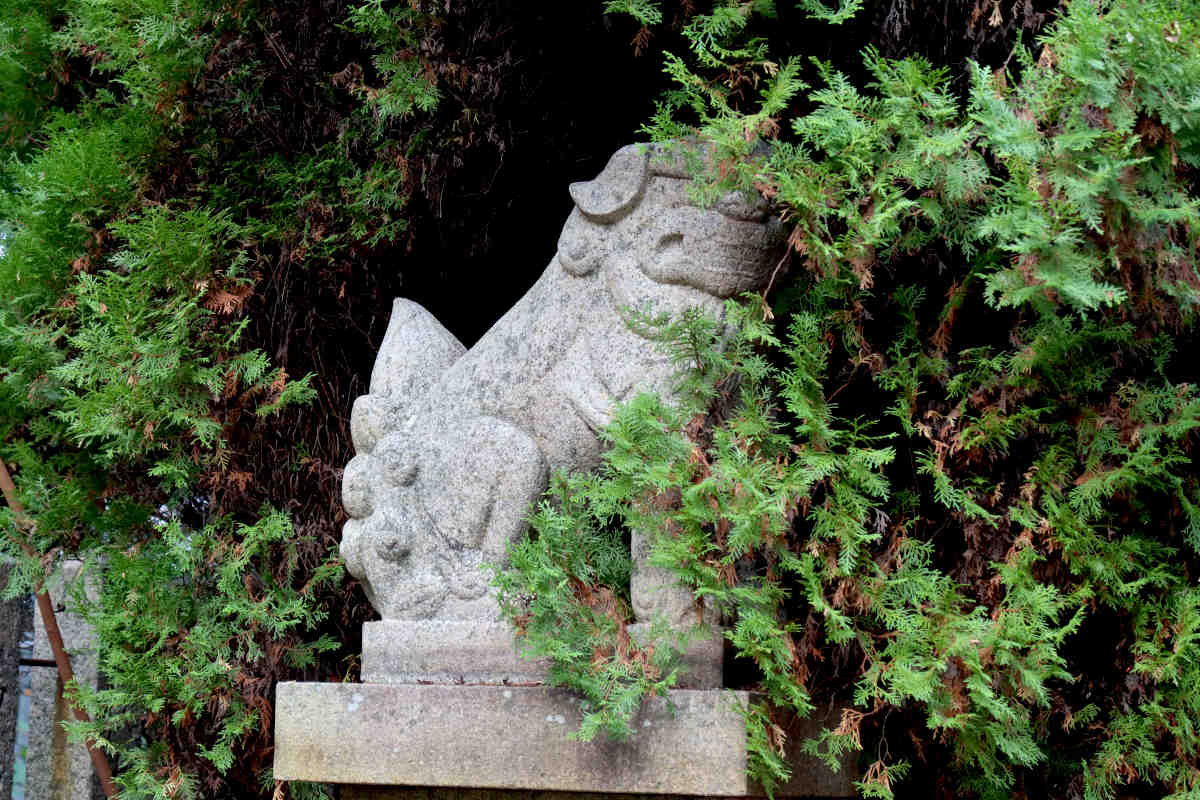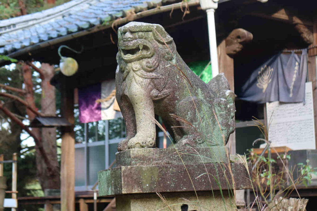 本堂の少し手前に狛犬。吽型の方は半分木々に囲まれていました。口の部分はよく見え、口を閉めているのではなく、歯を食いしばっているようでした。