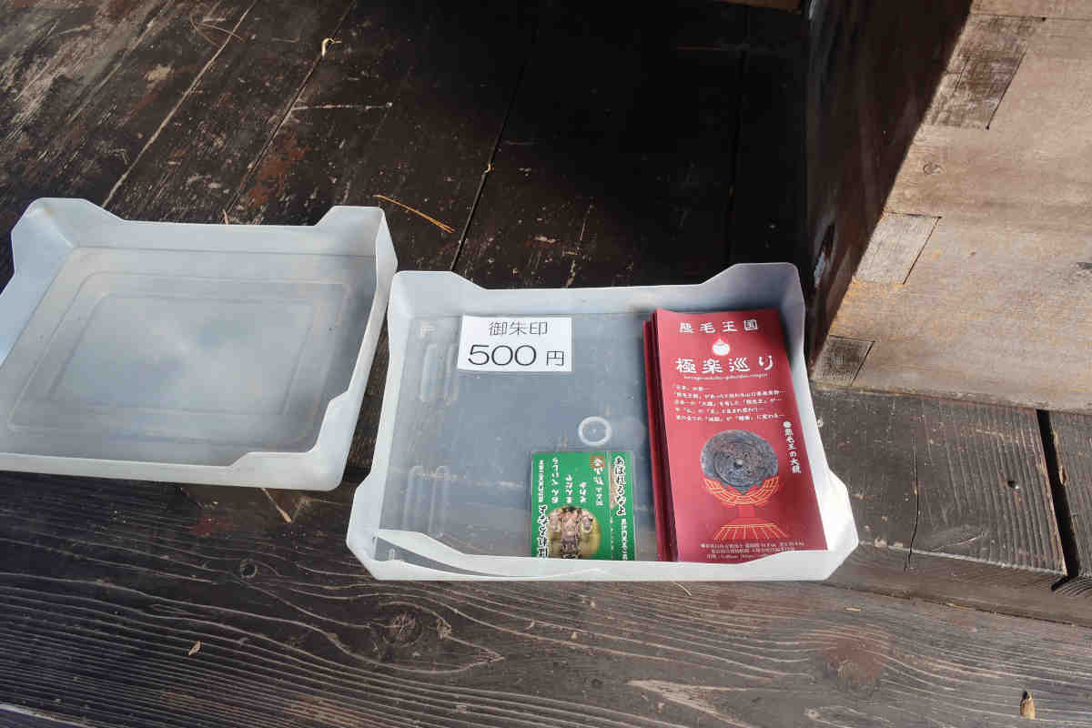書置きの御朱印が置かれているとの情報だったのですが、確かに本堂前のお賽銭箱の上に「御朱印500円」と書かれたケースがありましたが、肝心の御朱印は無く、極楽巡りのパンフレットと毘沙門天の御真言カードのみでした。かなり長期間、補充も無く放置状態かな(^_^;)?