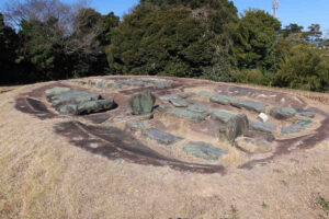 先ほど御朱印を頂いた富任八幡宮に参拝後、さらに南下して、神社仏閣とは違いますが、弥生の御朱印があると言う綾羅木郷遺跡へ向かいました。マップを見ると北側から遺跡や古墳が続き、一番南側に下関市立考古博物館が経っているので、南下しながら見て回れると思ったら、遺跡や古墳は博物館の塀に囲まれた敷地内にあるので、一端、博物館のある南側まで下がって博物館の門から中に入ってから、また北側に向かう必要がありました。遺跡や古墳を見て回った後に博物館内の展示物を鑑賞後、入り口近くの人が居る受付に。受付で御朱印の台紙を貰って、自分で向かい側の机の上の朱印を押して、日付を書くというシステムになっていました。朱印の試し押し用の紙も用意されていましたが、大丈夫だろうと台紙に押したら、無茶苦茶薄くなってしまいました(^_^;)