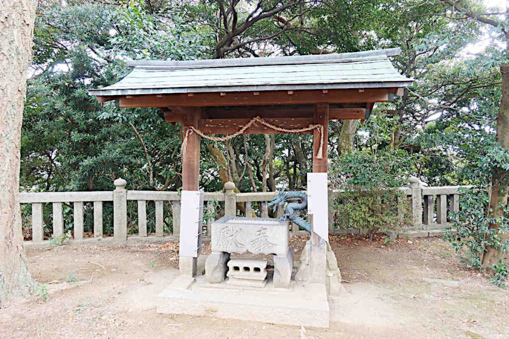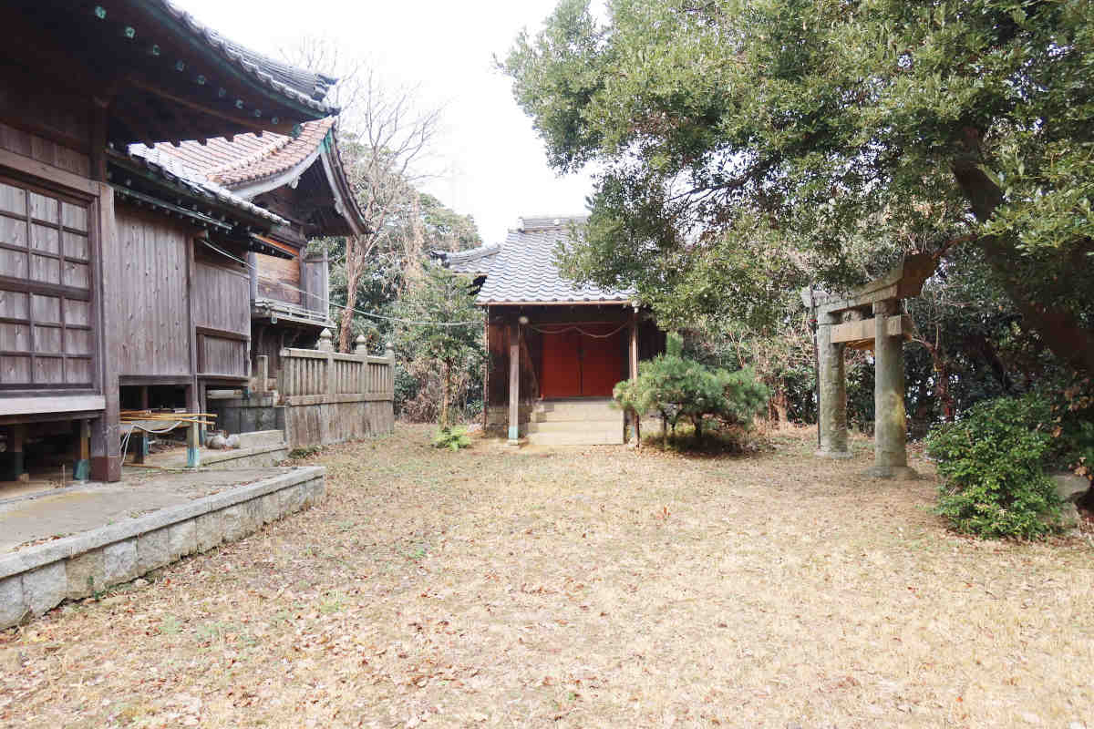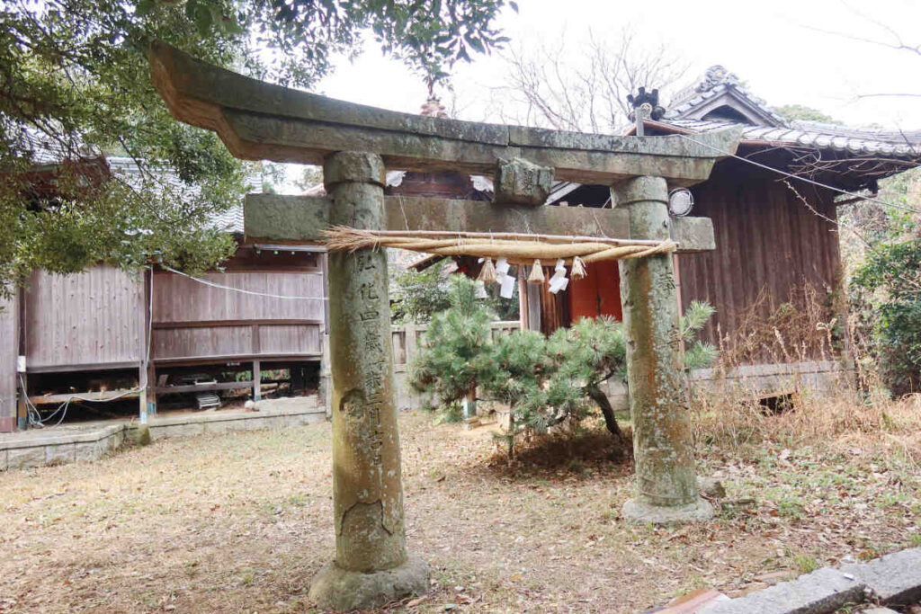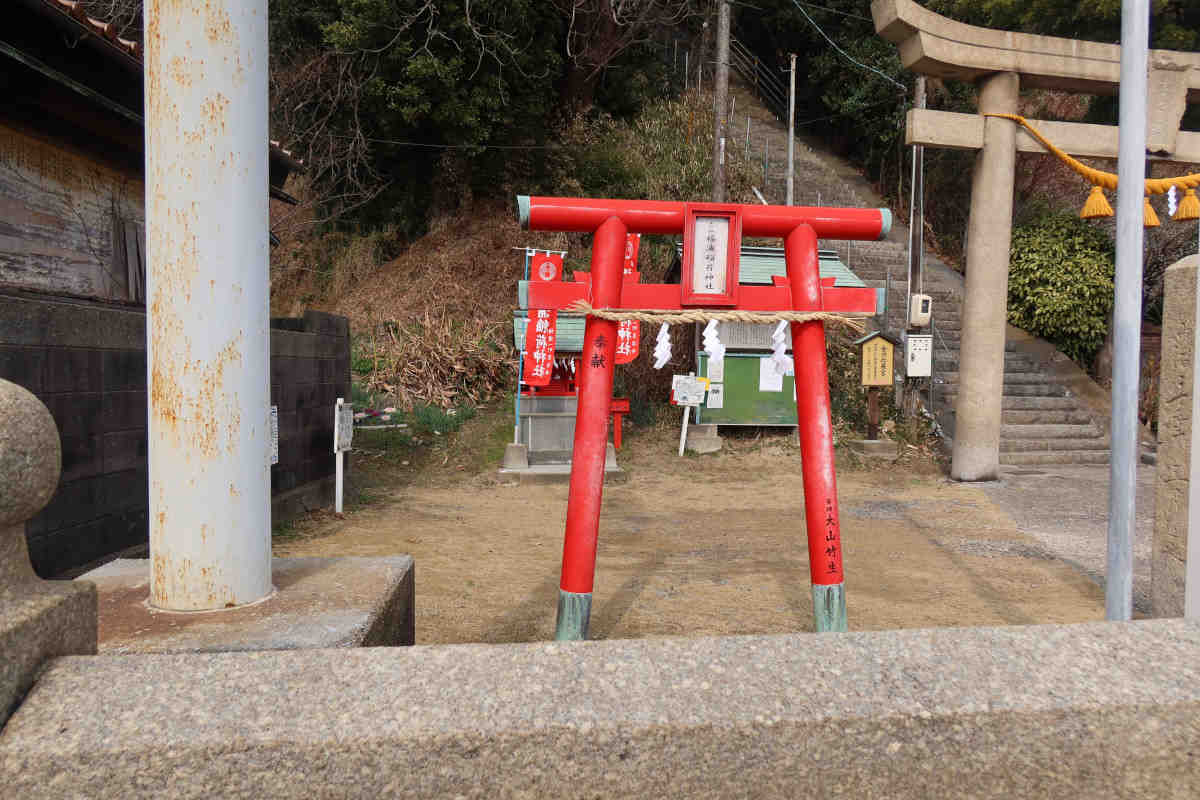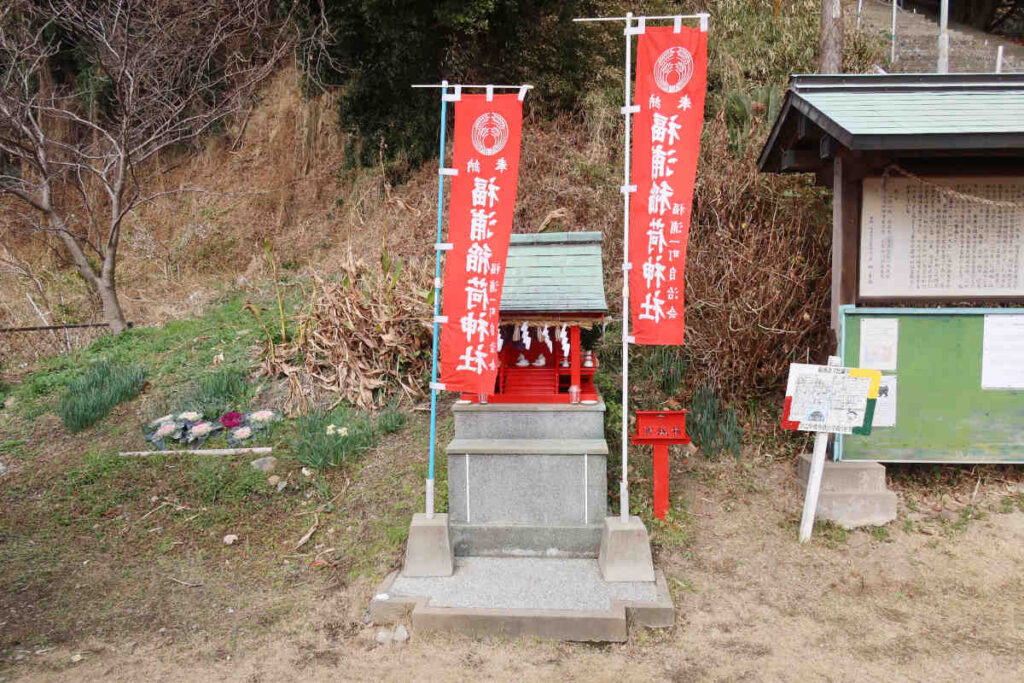 大きな石鳥居の左前に「福浦稲荷神社」と書かれた扁額を掲げた小さめの赤鳥居が立っていてその少し後ろに福浦金刀比羅宮の境内社の福浦稲荷神社の祠がありました。赤鳥居と道路の間には、玉垣が有る為、横から回って行かないといけません。屈まないと通れない大きさでした。
