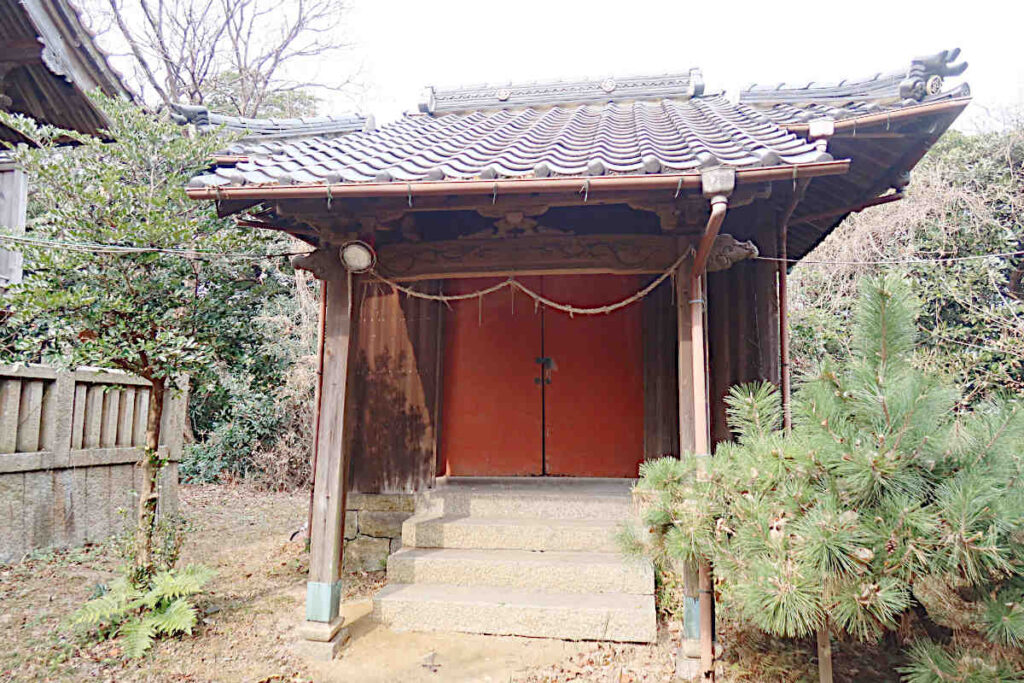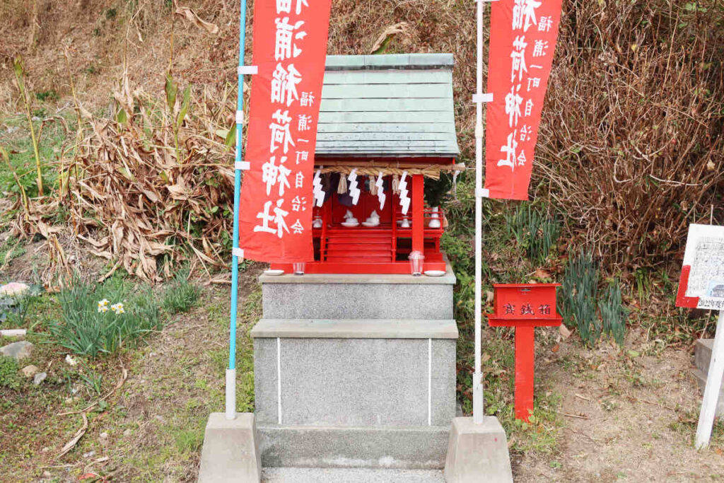 銅製か?青緑の屋根に赤い建物が石の段の上に乗った小さな祠でした。幟は立ってましたが、前面にはお皿がある位で飾りは少なめでした。色々なものを置くスペースがあるので、以前は色々と飾られていたのかもしれません。