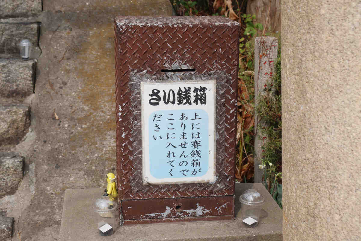 また、石段の右側にお賽銭箱が置かれていて「上には賽銭箱がありませんのでここに入れて下さい」とのメッセージがありました。またまた、勝手な推測ですが(^^;)、回収するのに上まで登って行くのが大変だから下に設置したのかな? と(^^;)  上の社殿まで3ルートありますが、いずれも、自動車等は駄目で自分の足で登るしか無いようです。