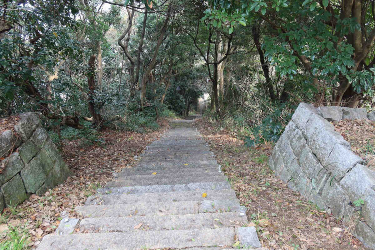 福浦金刀比羅宮に向かう途中の彦島福浦湾頭兜山の西側に福浦金比羅公園入口との石碑から山の方に道が続いていました。確認はしていませんが、恐らく、そこから、公園を経由して福浦金刀比羅宮の拝殿から左に向かっていた道に繋がるのではと思います。