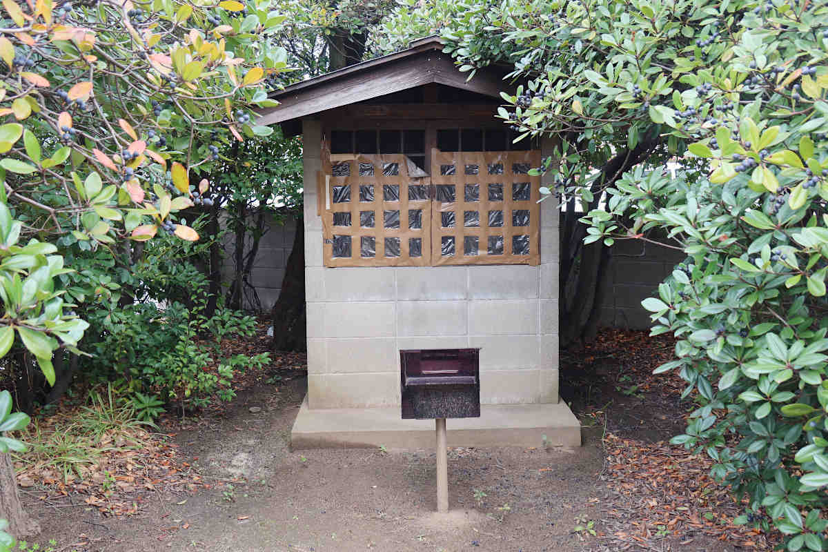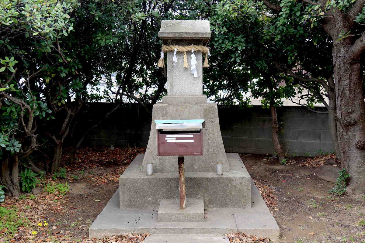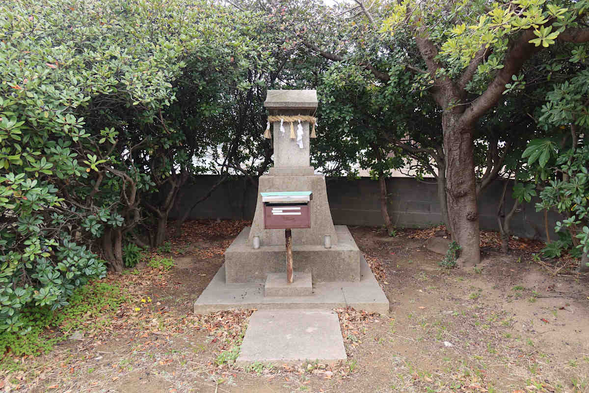 鳥居や狛犬は無く、小さな石の祠がたっていました。お賽銭箱と注連縄が巻かれてましたが、それ以外の装飾は無く、文字とかが刻まれている訳でも無いので、見ただけでは神社の名前も分からないです。石の祠の左側にもうひとつコンクリートブロックで造られた祠?らしきものがありましたが、こちらも、名前も何の説明もありませんでした。
