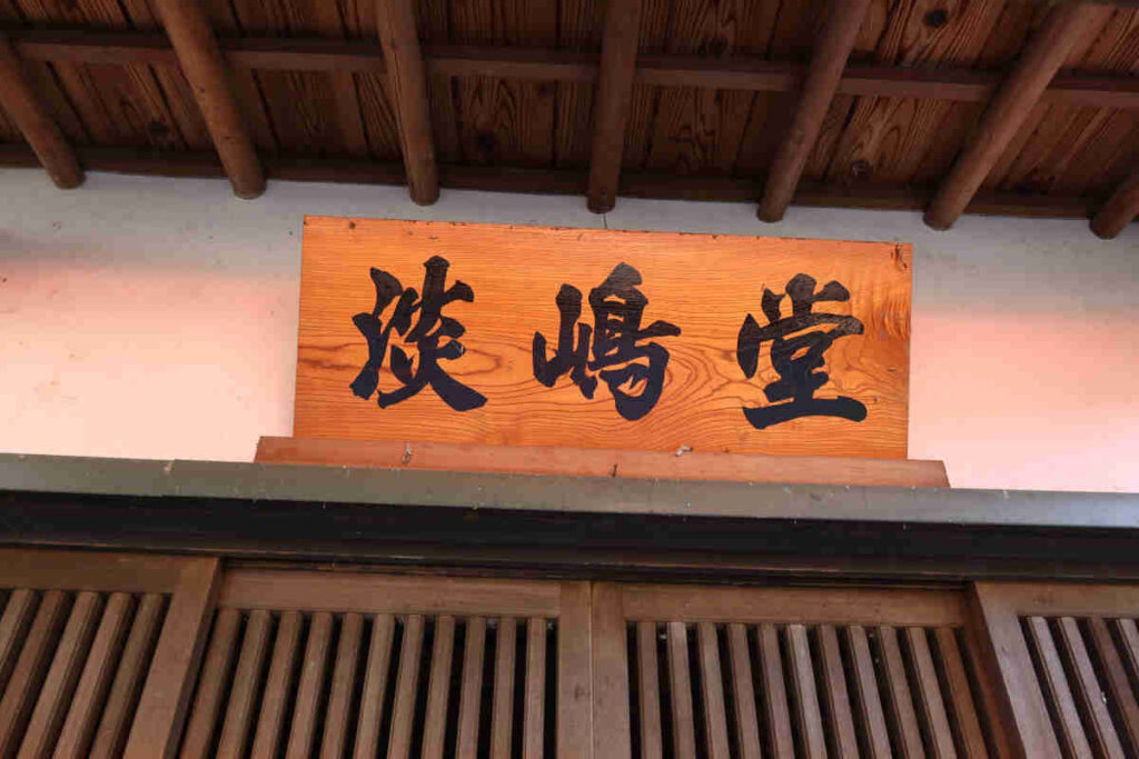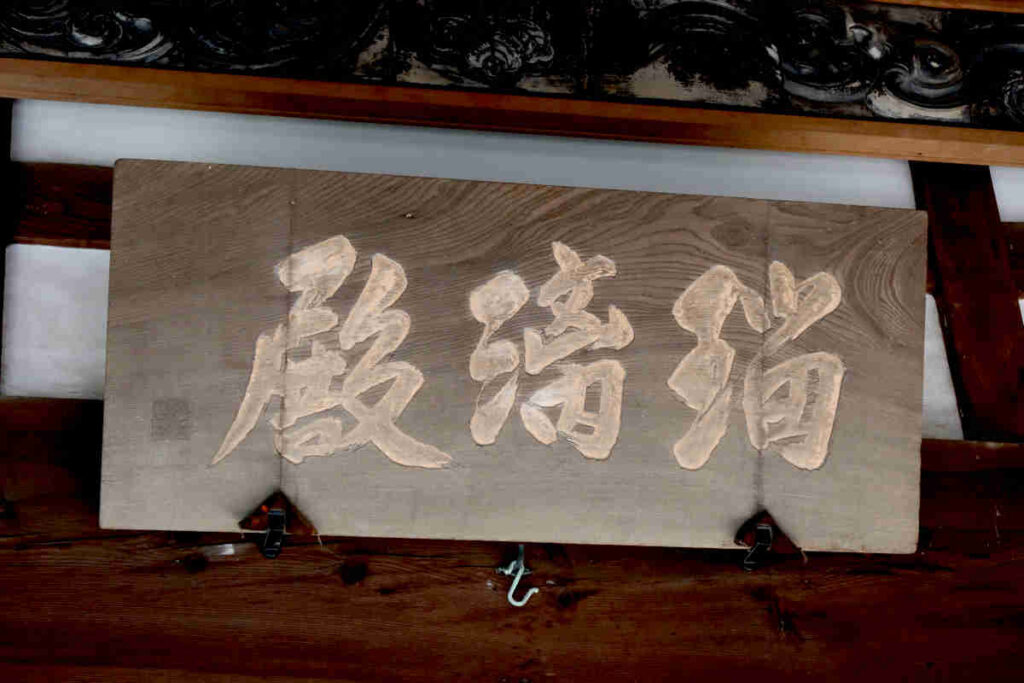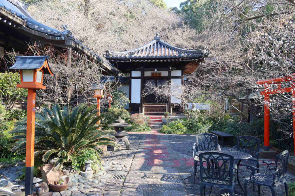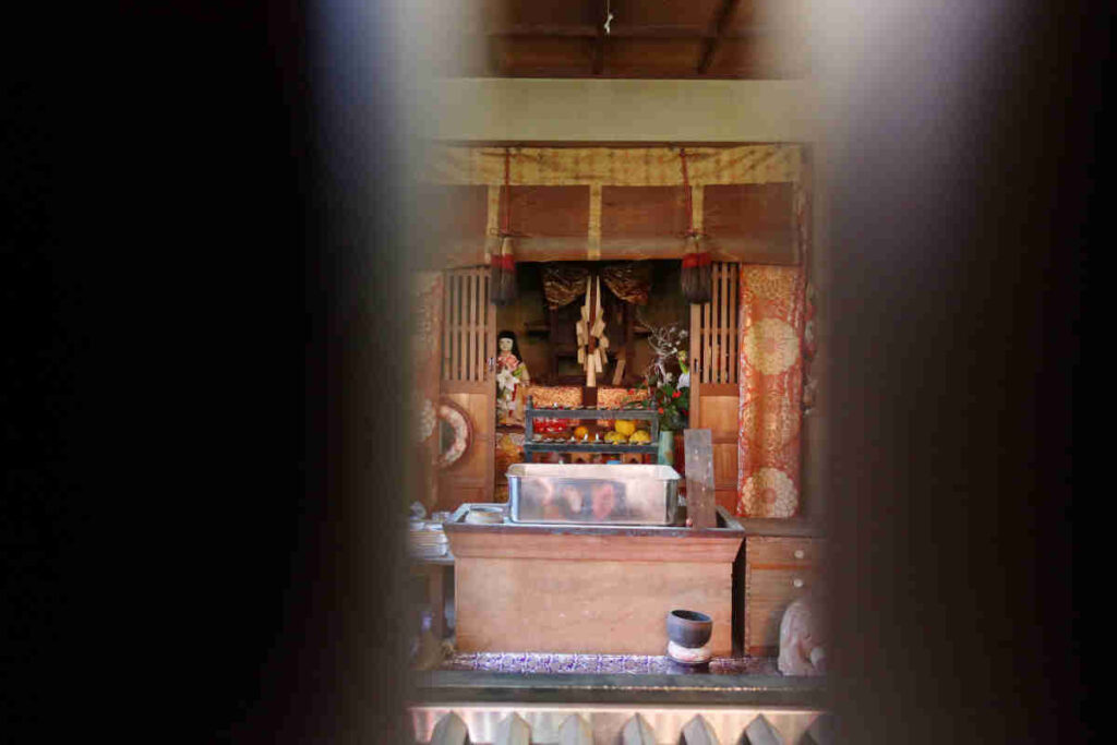 山門の先は、ちょっと狭めの道に沿って植物の緑が飾られ、周りを建物で囲まれた空間になっていました。正面には護摩堂。右側には赤鳥居と淡嶋堂、隙間から中を覗くと大麻(おおぬさ)みたいなものと人形が見えました。左側が本堂のようでした。扁額は「瑠璃堂」となっていました。本堂前には、撫ぜながら祈念すれば願いが叶うという祈願石(撫ぜ石)が置かれていました。