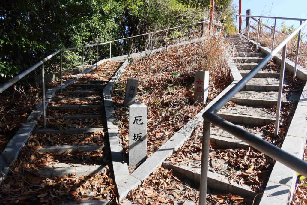 護摩堂の裏辺りから外に出ると目の前に紅葉稲荷神社、その左側から真っすぐ奥の院に向かう石段の道と日和山八十八カ所霊場への道がありました。