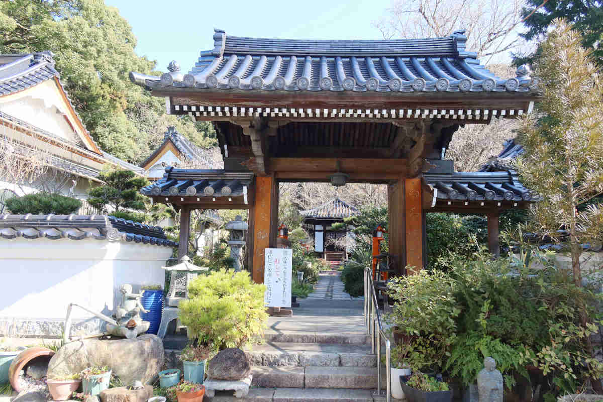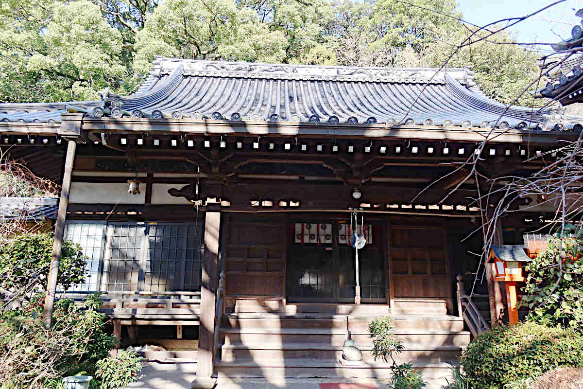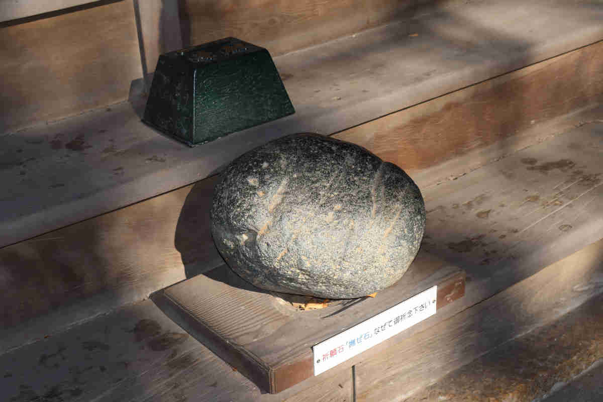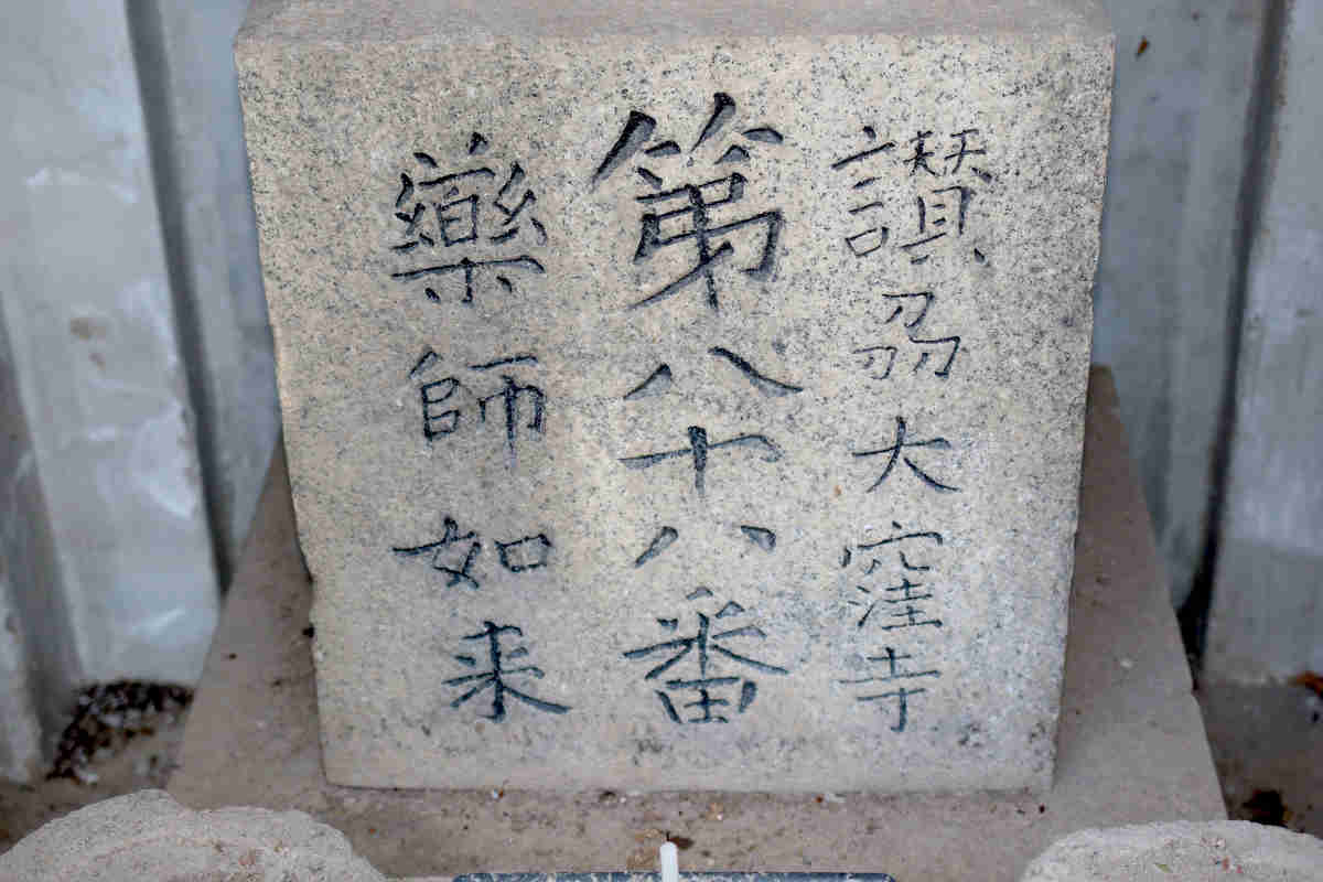 山門の先は、ちょっと狭めの道に沿って植物の緑が飾られ、周りを建物で囲まれた空間になっていました。正面には護摩堂。右側には赤鳥居と淡嶋堂、隙間から中を覗くと大麻(おおぬさ)みたいなものと人形が見えました。左側が本堂のようでした。扁額は「瑠璃堂」となっていました。本堂前には、撫ぜながら祈念すれば願いが叶うという祈願石(撫ぜ石)が置かれていました。