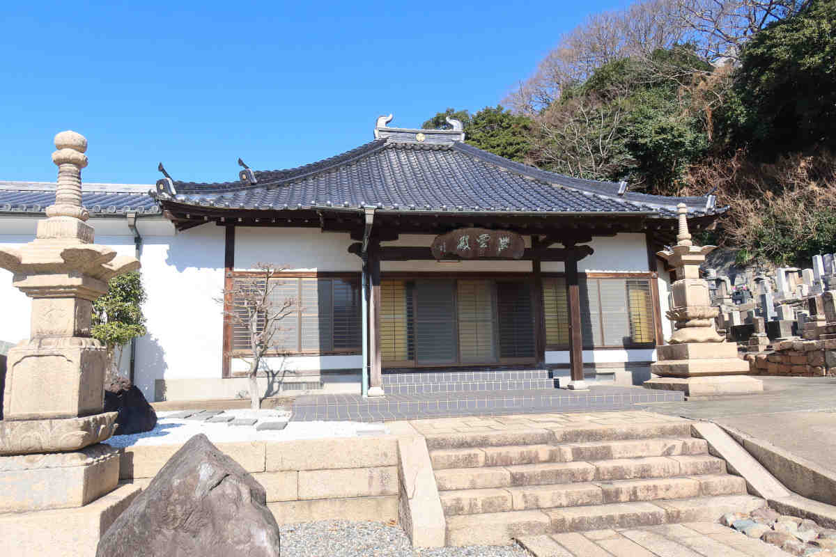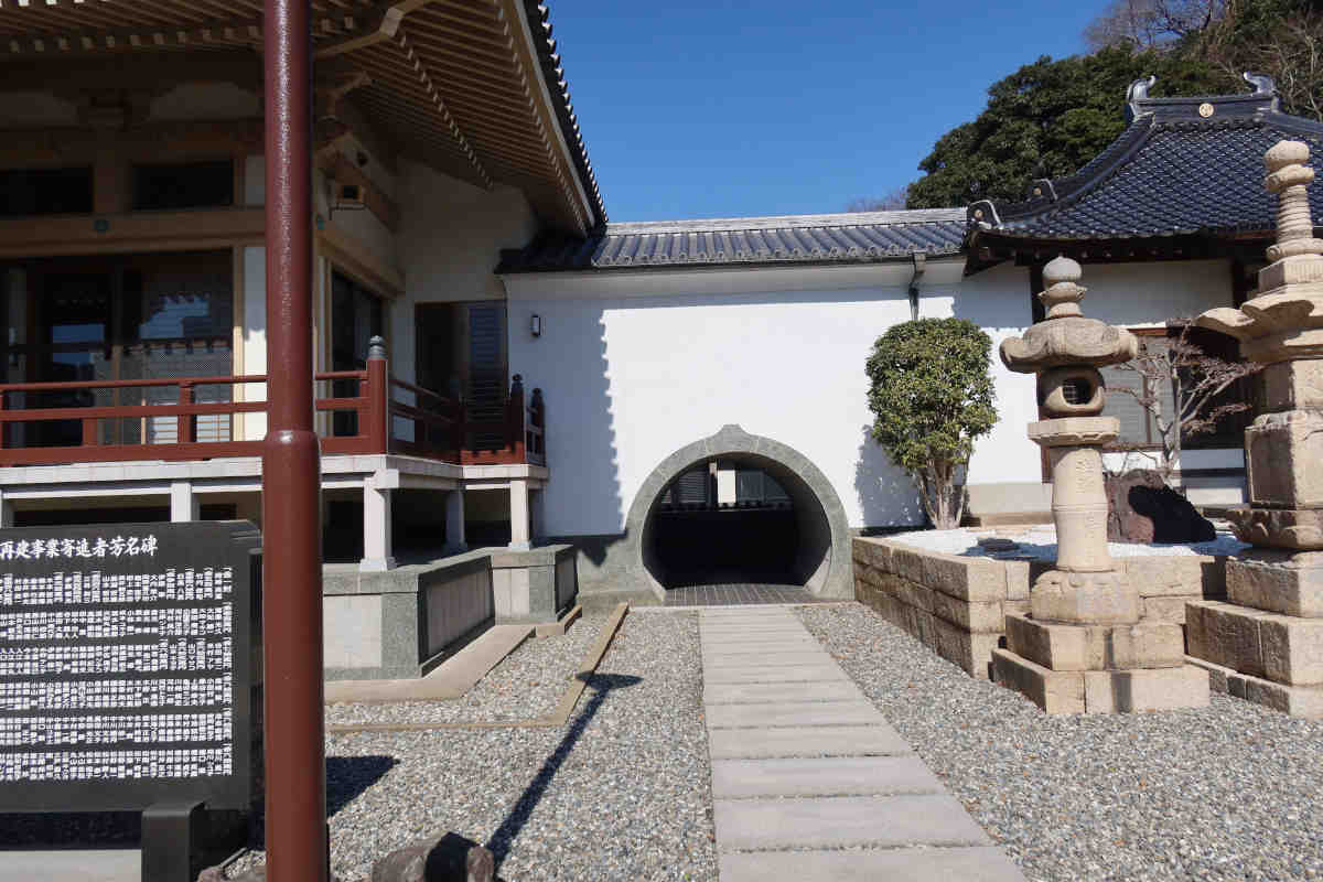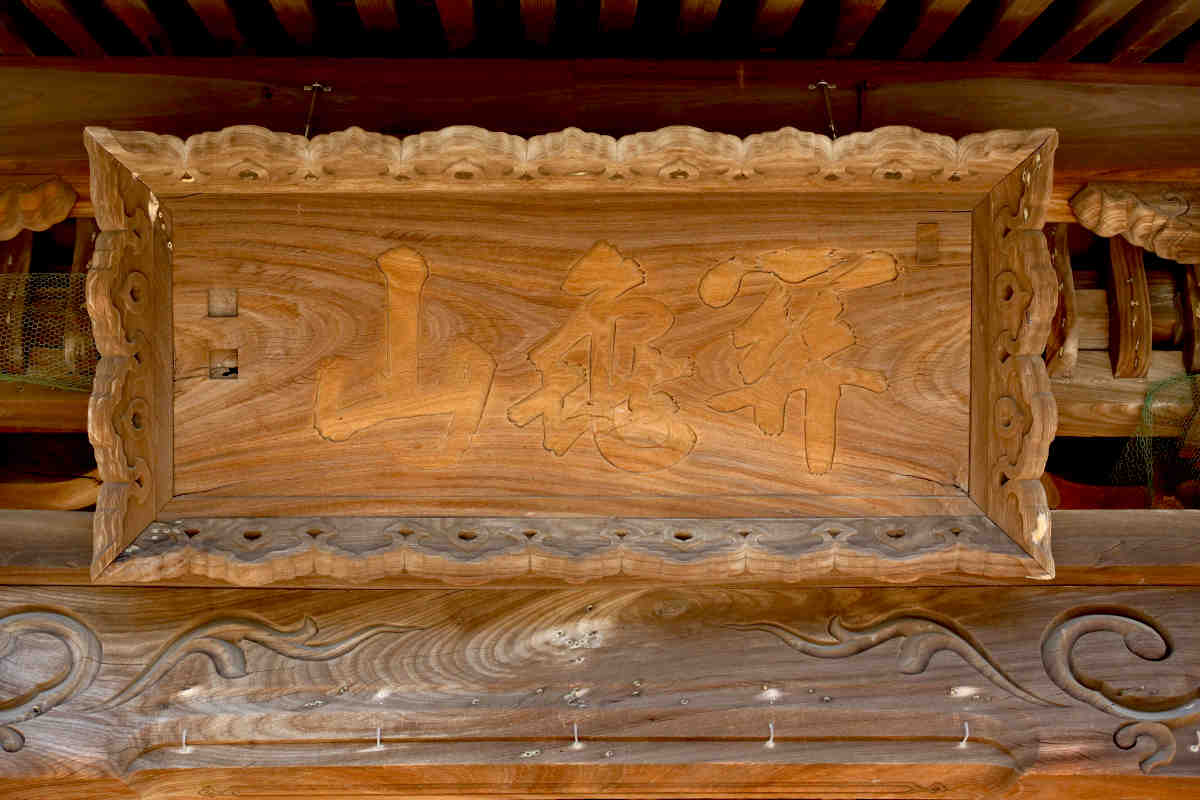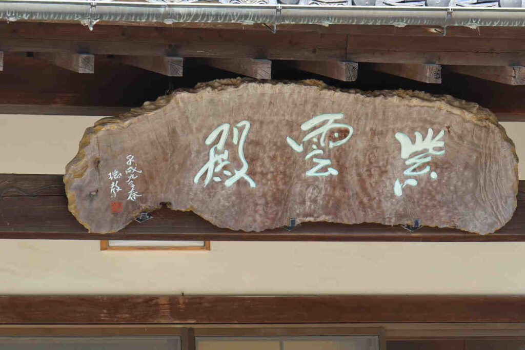 三門の先、正面には本堂、その右側には「紫雲殿」と書かれた扁額を掲げた紫雲殿が立っていました。扁額は長方形では無く、石かな?を輪切りにした味のある形をしていました。見える範囲には、その他に建物が見えず、社務所や庫裏を探した所、本堂と紫雲殿の間の壁に開いた穴の奥に何か見えたので、トンネルの奥に行ってみたら、そこが庫裏だったようです。
