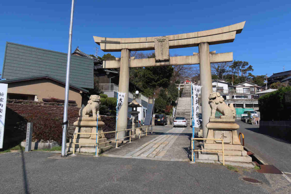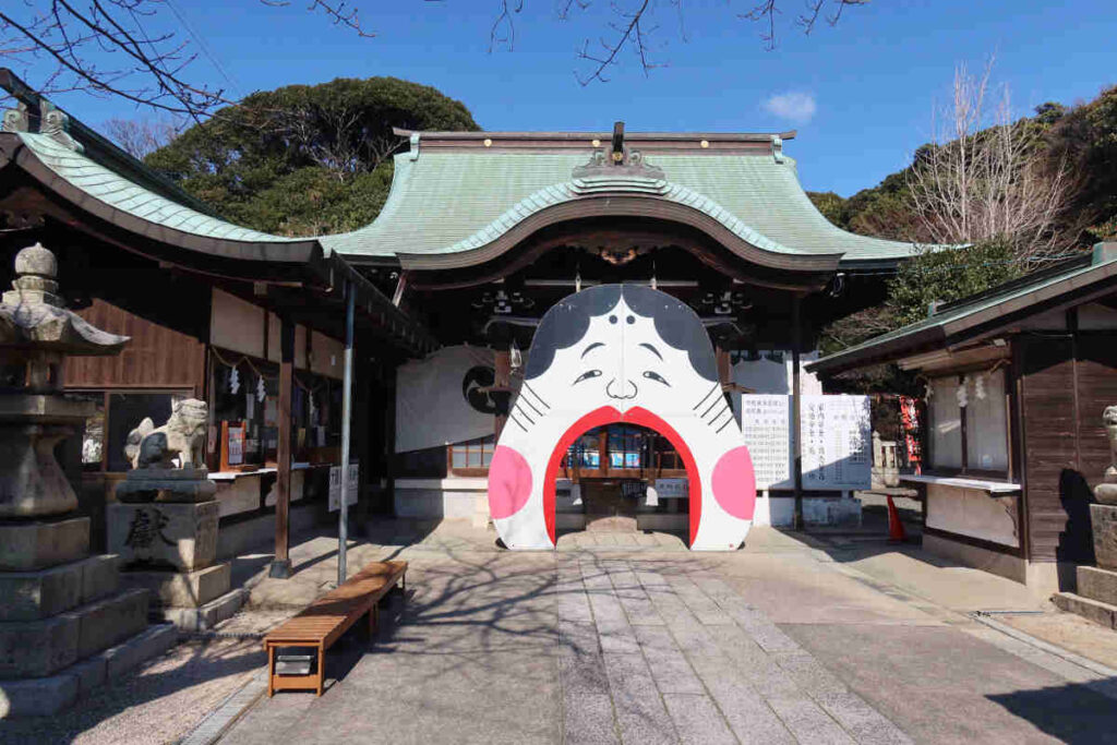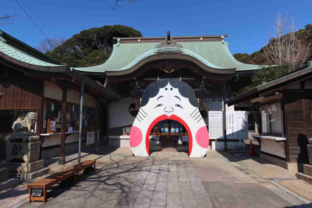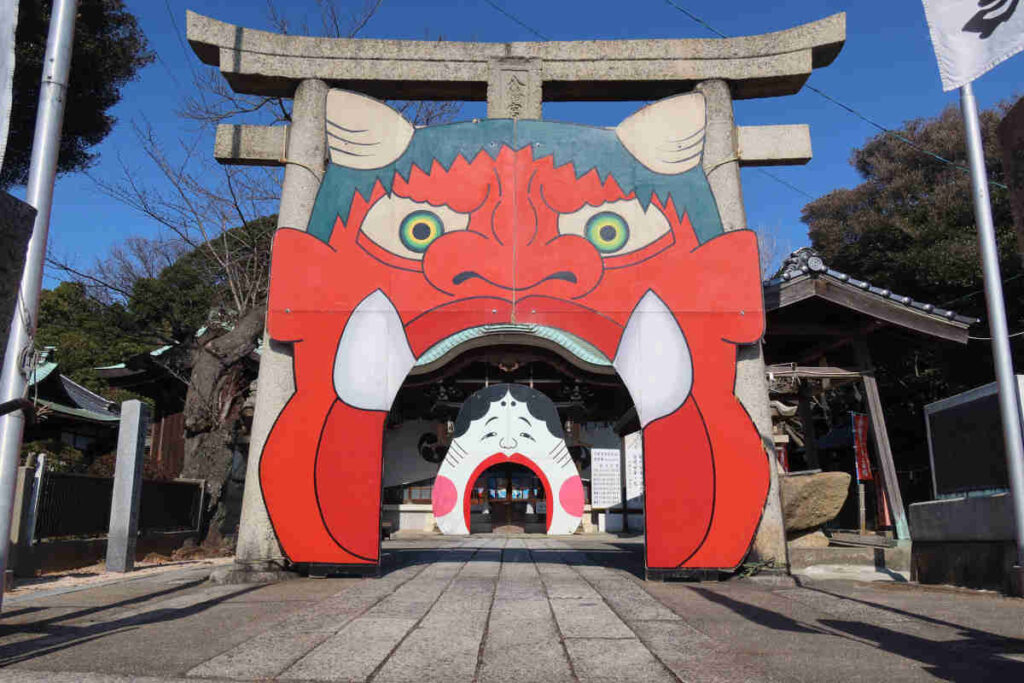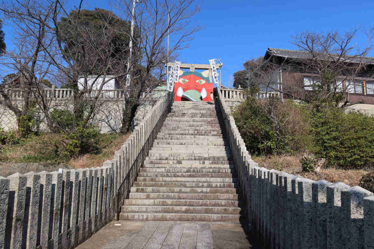 大きな道路からほんの少し入った場所に入り口があり、3つの鳥居、4対の狛犬、長い参道と石段の先に社殿がたっていました。2月18日の参拝でしたが、節分の時と思われる、鬼とおかめ?(おたふく?)の大きな面が鳥居と拝殿前に飾られていました。