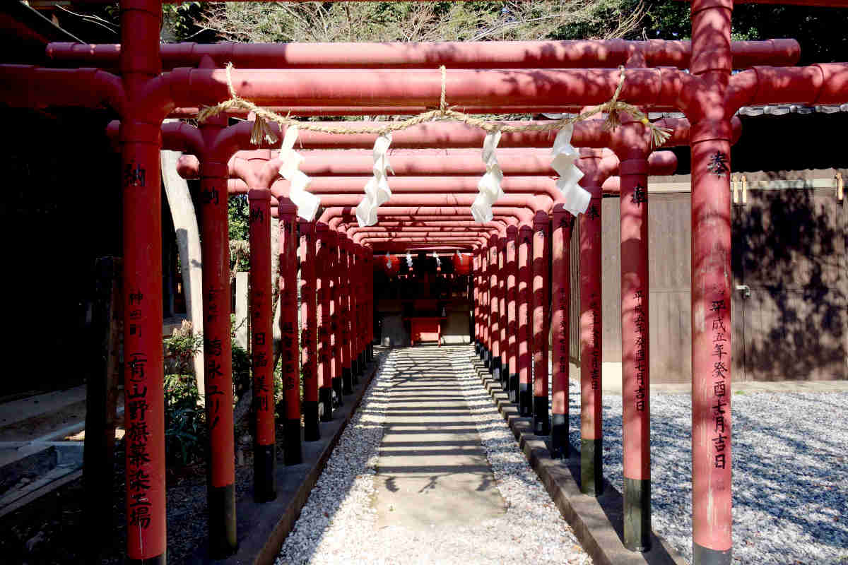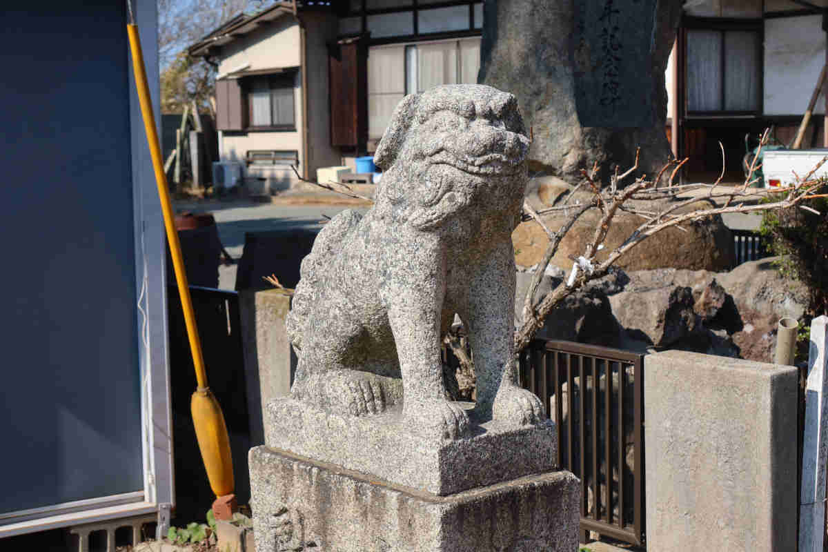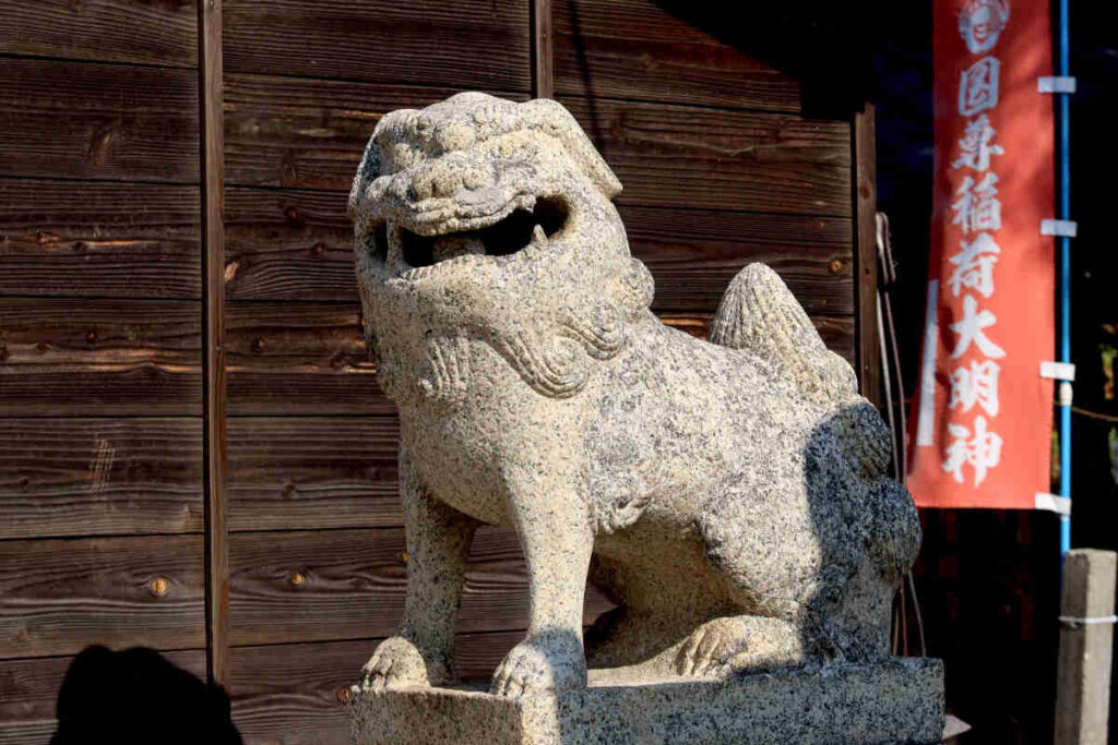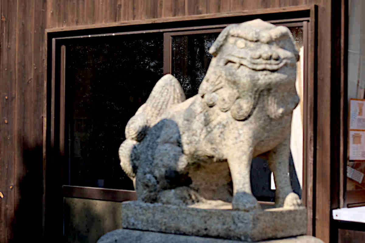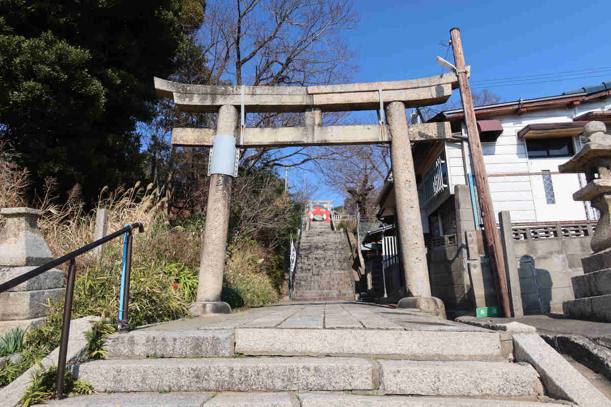 大きな道路からほんの少し入った場所に入り口があり、3つの鳥居、4対の狛犬、長い参道と石段の先に社殿がたっていました。2月18日の参拝でしたが、節分の時と思われる、鬼とおかめ?(おたふく?)の大きな面が鳥居と拝殿前に飾られていました。