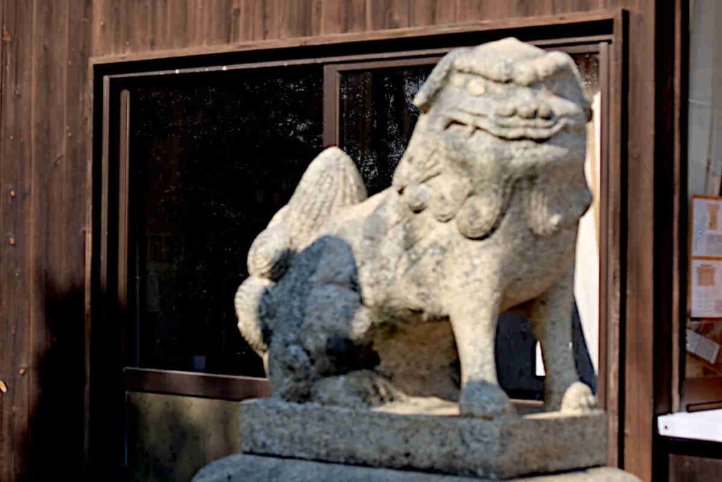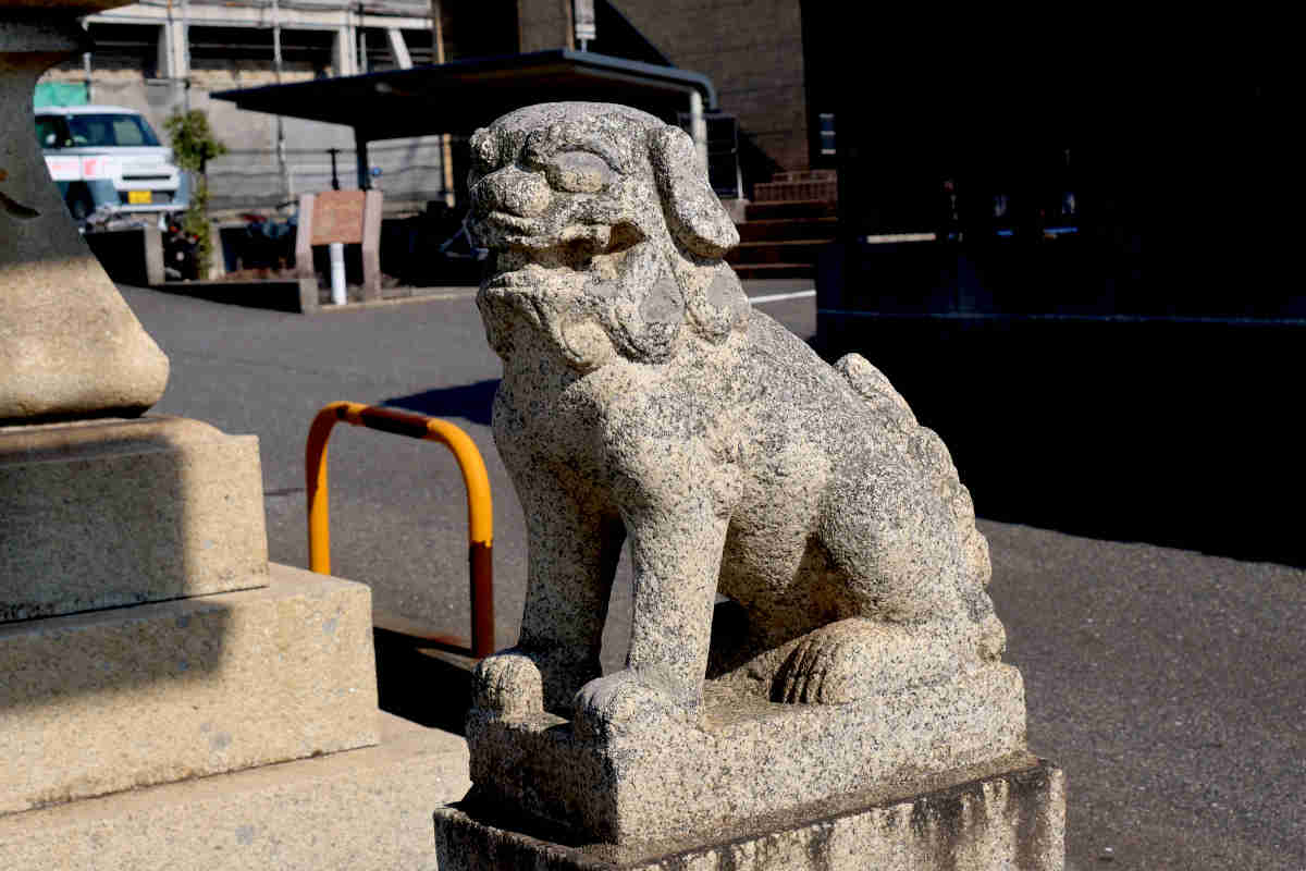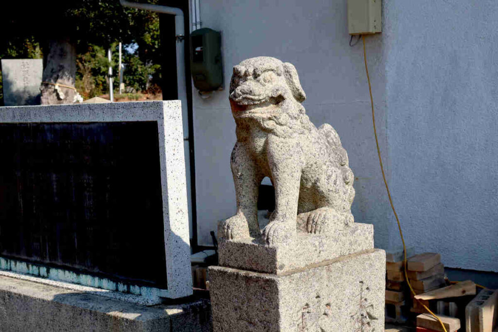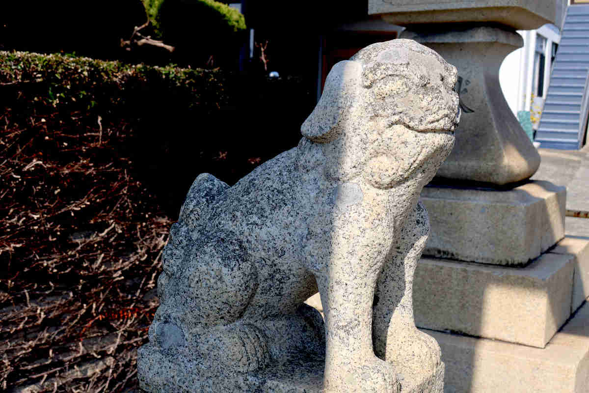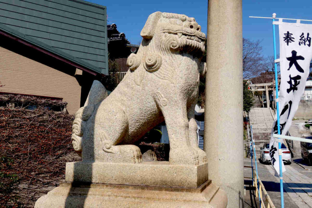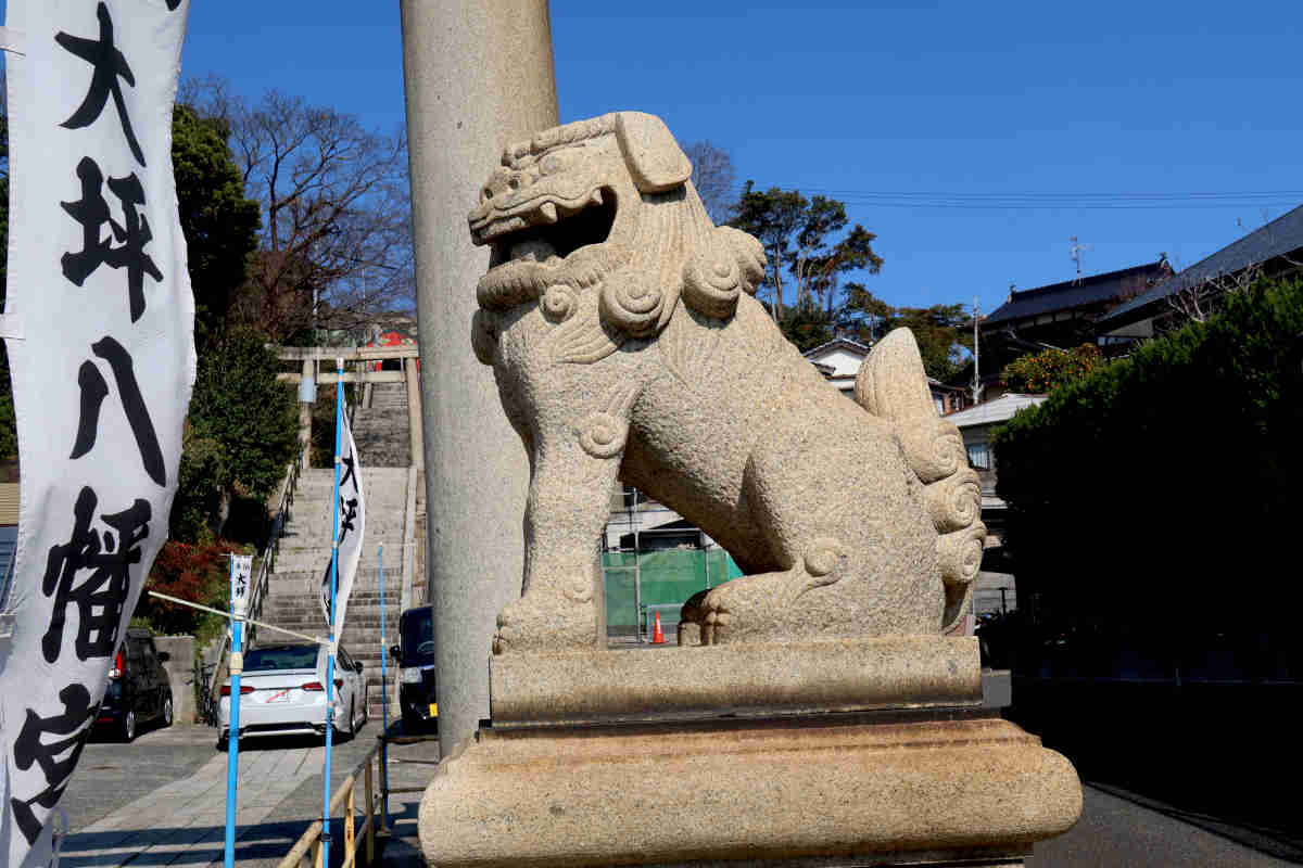 一の鳥居は徳山の黒髪石を使い建てられたもので、下関一の石鳥居との事です。「大坪八幡宮」と彫られた扁額を掲げていました。鳥居の前に少し大きめの狛犬が1対、後ろには小さ目の狛犬が1対設置されていました。少し参道を進んだ先に石段、二の鳥居(扁額なし)、更に石段を登って行くと三の鳥居(扁額:八幡宮)。三の鳥居前に1対、拝殿前にもう1対の狛犬がいました。狛犬4対でしたが、一番手前、入口の狛犬以外は小さ目でした。