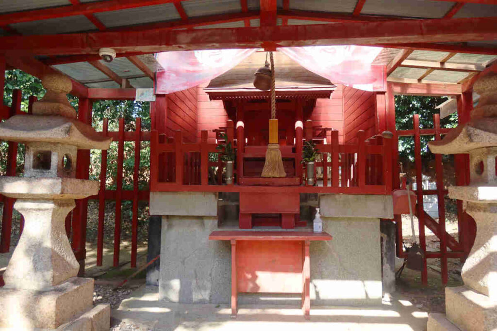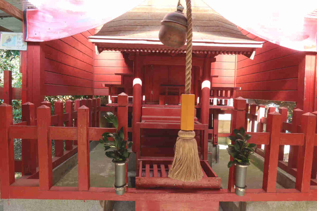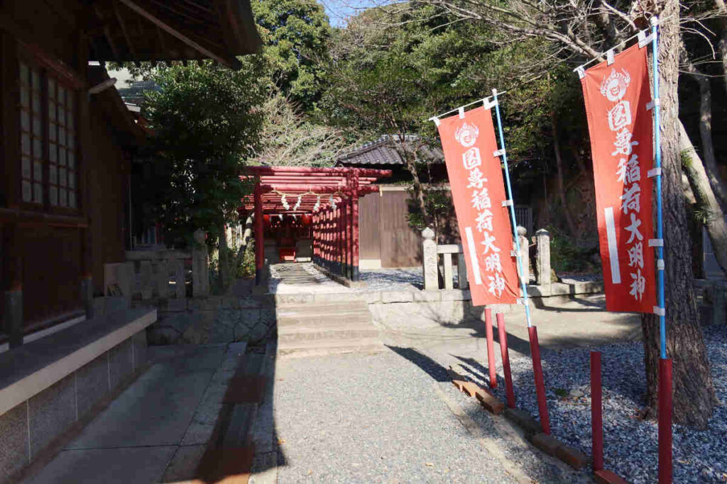 境内社の國尊稲荷大明神は、大坪八幡宮の拝殿の右側に参道があり、本殿の右側辺りから赤鳥居が並び、一番奥にコンクリートの台の上に真っ赤なお社が祀られていました。お社の手前には屋根が付けられていてちょっと薄暗くなっていて、お社の上部と下部の明るさの差が大きかったです。