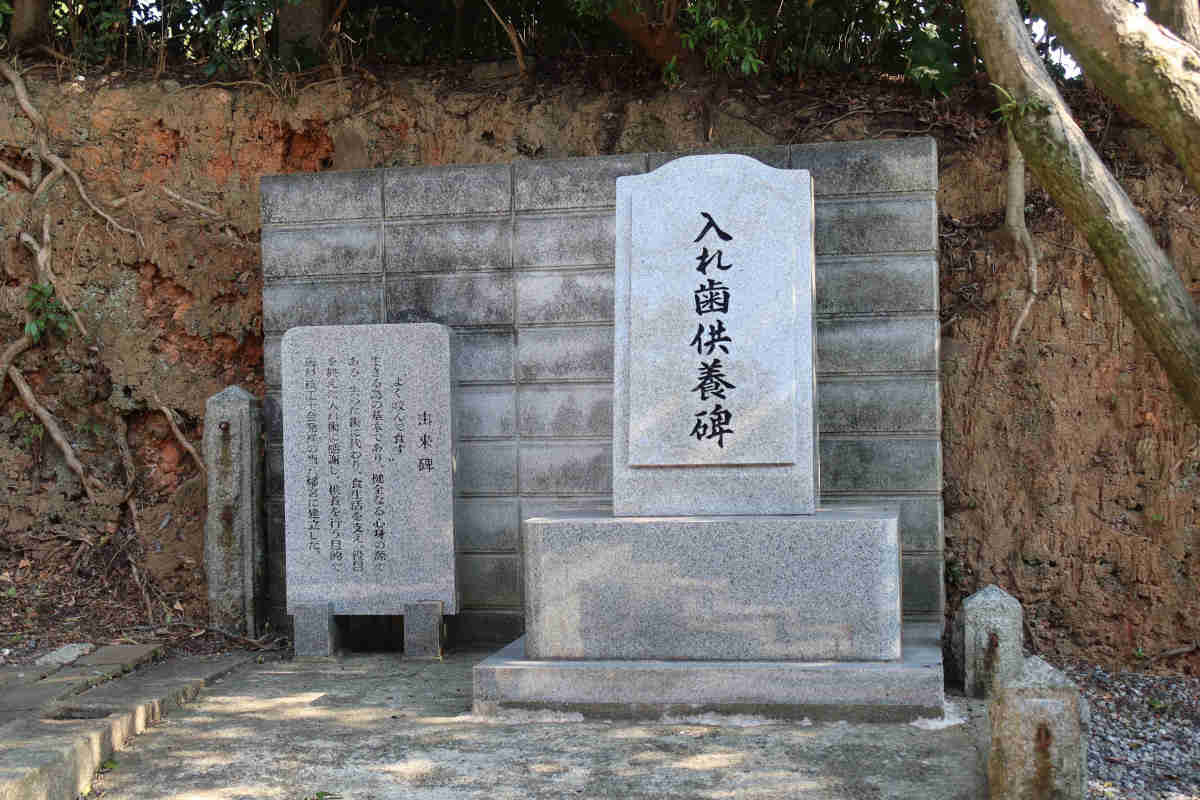 國尊稲荷大明神の右側に入れ歯供養碑と由来碑がたっていました。『よく咬んで食す。生きる為の基本であり、健全なる心身の源である。失った歯に代わり、食生活を支え、役目を終えた入れ歯に感謝し、供養を行う目的で歯科技工士会発祥の当八幡宮に建立した。』と記されてました。
